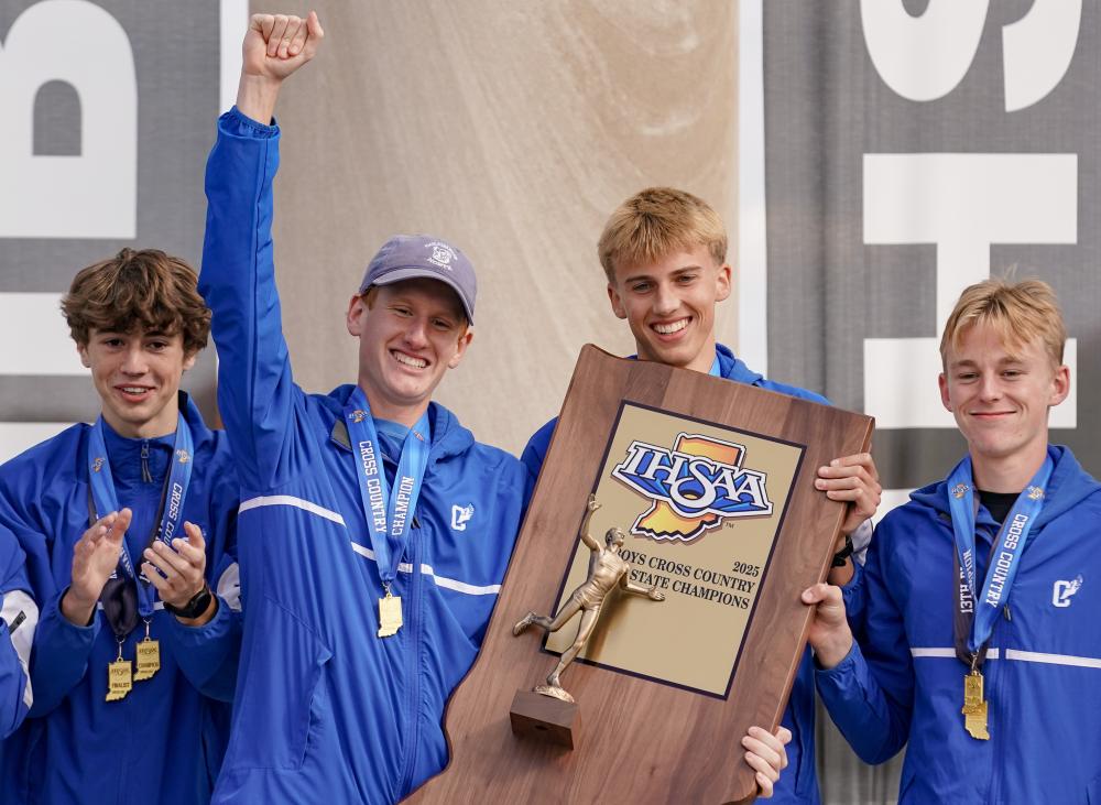 Calvin Seitz Beats Noah Bontrager With Late Lean To Win Boys Individual Title In Indiana; Libby Dowty Regains Title By David Woods for DyeStat Bobby Goddin Photos TERRE HAUTE, Ind. – The irony of the victory was, well, what once had been lack of iron. Calvin Seitz, then a sophomore, was coping with anemia last year. That lingered into spring, and he declined to represent Jasper High School in track. Now, Seitz is one of the biggest things to hit Springs Valley High since . . . well, since Larry Bird was hooping in French Lick, Ind. Seitz pushed the pace, nearly separated from Westview’s Noah Bontrager, and at the end had to out-lean his rival Saturday. Both were timed in 15:01.3 for 5,000 meters on the LaVern Gibson Course. Detailed results showed first and second separated by two-hundredths of a second, 15:01.22 to 15:01.24. Maybe it was no coincidence they were in Terre Haute, where Bird did his college thing. Did Seitz know he had won? “I had no idea, man,” he said. Not until he was summoned to the tower where the livestream announcers were stationed did he realize he really was a state champion. In 79 previous state meets, Springs Valley had never placed anyone in the top 10. Hard race, for sure. “Maybe a little more than I wanted to be,” Seitz said. “It’s all about that last 400. Awesome last 100 meters.” Seitz led through a 4:40.9 mile and 9:37.8 two-mile. He pushed harder as he and Bontrager broke away over the closing kilometer, finishing six seconds ahead of third-place John Libs of Noblesville. “I almost didn’t hang on,” Bontrager conceded. “Really smart of him. He’s a great runner and knows his stuff.” Bontrager was second last year and won a 4:02.79/8:51.22 double at June’s state track meet. But a recent illness affected him so much that he was second in a regional, so he was not necessarily favored. Bontrager moved up in the closing steps and might have eclipsed Seitz, but the latter leaned. Afterward, the winner helped Bontrager to his feet. “I just couldn’t get up. I felt terrible,” Bontrager said. Still, the Notre Dame commit remained upbeat about what’s ahead. He aims to qualify for both Nike Cross Nationals and Brooks (formerly Foot Locker) Nationals. In those nationals in 2024, he was 19th and 16th, respectively. And he wants to become Indiana’s first sub-4-minute miler in high school. Not even Cole Hocker did that. Seitz, meanwhile, is relieved to be returning to his freshman form. Two years ago, he was ninth at state and then, in December 2023, he became the Junior Olympics national champion for boys 13-14. Before the 2020 pandemic, he was a tennis player. He learned he was better at running. Even better at running after amending his diet to include more meat. “It just took time to stack the days up,” said Seitz, who transferred from Jasper over the summer. In team standings, No. 8 Columbus North won emphatically with 56 points, the best score since Columbus North had 43 in 2003. It was Columbus North’s seventh state title, all since 2002, and first under coach Rick Sluder. No. 21 Noblesville was second with 131, Homestead third with 154 and defending champion Bloomington North fourth with 169. Columbus North had edged Bloomington North 34-44 in the Evansville Regional. There was a 31-second spread from Columbus North’s first to fifth runners, all in the top 27. Topping the Bull Dogs was eighth-place Jace Works, who has run a 1:50.7 split in the 4x800 relay and now has a 15:13.9 time in the 5,000. Denton Sluder, son of the coach, was 13th in 15:31.9. “We went into June with a pretty good idea we could be a top two, top three team,” the coach said. “And then, as the season went, we knew what our goal was. Our goal was to try to win.” Bloomington North placed two in the top 10, Jacob Mitchell (fifth) and Caelan D’Onofrio (10th). Bloomington North’s Caleb Winders, who set an Indiana record of 1:46.85 in winning the New Balance nationals 800 meters, climbed 12 spots in the last mile to finish 20th in 15:40.3. Indiana girls: Carmel, Dowty win again Libby Dowty was defending state champion a year ago, and she said she “let the nerves get to me.” On this afternoon, no one was getting close to her. The Indian Creek senior became state champion again with a time of 17:10.2, just off the state meet record of 17:06.7 she set in 2023. She won by eight seconds over runner-up Macey Thompson of Lake Central. Defending state champion Mallory Weller of Fort Wayne Concordia Lutheran was sidelined by a calf injury. Dowty became the fifth Indiana girl to win state titles as both a sophomore and senior. “It’s pretty incredible,” she said. “God has taught me a lot through my loss, and it made me stronger and a better person.” Dowty is perhaps as strong as it gets in cross country, considering the Louisville commit is also a state qualifier in wrestling. But for grit, no one is outdoing Sadie Foley. Foley, who helped Carmel win a state track title while running on what turned out to be a broken ankle, led Carmel to a cross country title. No. 6 Carmel’s girls scored 100 points, extending their record to 21 state titles in the sport. Concordia Lutheran was second with 129, Bloomington South third with 150 and Homestead fourth with 172. Foley finished third in 17:22.6 and teammate Larkin Taylor 10th in 17:46.0. Annabel Pollert, who secured the track title by finishing third at state in the 3,200 meters, was 22nd in 18:10.2. In track, Foley was tripped near the start of the 1,600 before the race was recalled. She stayed on the track for several minutes receiving medical treatment, which included a taped ankle and bandaged leg. She came away with scrapes and spike wounds. She regrouped to finish fifth in the 1,600 and ran third leg on a 4x400 relay team that was second. Carmel needed her points to beat Hamilton Southeastern 54-46. The next day, Foley was diagnosed with the fracture. She biked and cross-trained all sum