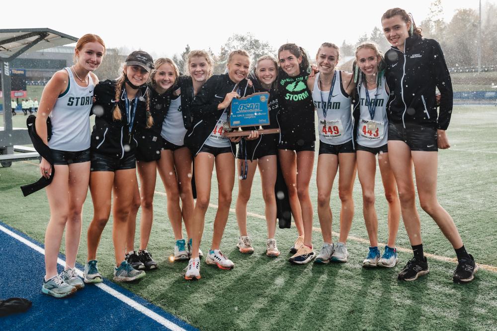 Summit Girls Slip Past Jesuit; Kate Peters Wins Showdown With Chloe Foerster; Jesuit Boys Fulfill Promise; James Crabtree Tops Loaded 6A Field By Doug Binder, DyeStat Editor EUGENE -- The return of the Oregon state high school cross country championships to Lane Community College was greeted a show talent and depth rarely seen in the state. The US#5 Summit girls edged US#8 Jesuit 55-58 in one of the best matchups outside of Colorado anywhere in the country. The US#4 Jesuit boys prevailed in a strong 6A boys field, motivated by second-place finishes in 2018 and 2019. And the individual races lived up to their billing. Junior Kate Peters of Lake Oswego used patience and a well-timed move to seize control of the girls 6A race after the 2-mile split, pulling away from Jesuit's Chloe Foerster in the first matchup of the season between the state's two unbeaten elite girls. The meet reached its crescendo in the final 200 meters of a 6A boys race that was perhaps the deepest in state history -- with 12 runners breaking 15:30 on a course that was extended back to a full 5,000 meters and buffeted all day by windy and wet conditions. INTERVIEWS | PHOTOS | ATHLETIC LIVE The Summit girls won for the 13th consecutive time, including the past three at the 6A level. In 2022, the school is expected to return to 5A where it has very little competition as a track and cross country power. "Especially this being my senior year, our goal going in was to win," Summit's Teaghan Knox said. "I think we executed and some girls had the best races I've seen all season." Knox is the lone holdover from the 2019 Nike Cross Nationals championship team -- and the 2021 version isn't far off that historic team. The 2019 team had a lower stick at No. 1 and was a bit stronger at No. 5. The competition between Summit and Jesuit brought out the best in both squads. "The first thing I said to the girls is we ran our best race all season and so we need to be proud of that," Jesuit girls coach Laura Harmon said. "Sometimes you go back to Jesuit and there's this mentality of if you didn't win 'What happened?' We executed really well and Summit did that-much better today." Peters, who has set her sights on the Eastbay Cross Country Championships, showed maturity by holding her fire in the first two miles. Then when it was time to go, she made a decisive change of pace that left the field and prevented it from coming down to a kick against the superior foot speed of Foerster, a 2:05 800-meter runner. KATE PETERS MAKES HER MOVE by Joe Zochert Peters finished in 17:28.7 and beat Foerster by seven seconds. The boys 6A race ended with a spectacular finish worthy of a race with no clear favorite and nearly 10 legitimate contenders. Sherwood's James Crabtree tried to run away from the field early and built a six-second lead in the first mile (4:37.7). But even he knew that the guys behind him would not concede without a fight. Franklin's Charlie North and Central Catholic's Wes Shipsey caught Crabtree with 500 meters to go and even passed him. But Crabtree managed to latch on and the three of them hit the track with 300 meters to go together. "We hit the track and negative thoughts started to creep in, and I just pushed them out," Crabtree said. "I put myself back into position around the corner and I just took a chance with 150 (to go) and just hammered it home." Crabtree hit the finish in 15:04.5 and North was next in 15:05.2. Shipsey was third in 15:08.1. The US#4 Jesuit boys, led by the fourth-place finish of Jacob Nenow (15:09.8), won its first team title since 2017 and fifth overall. Caleb Hildenbrand (12th in 15:28.3), Josh Augustine (15th in 15:44.5), Gus Clevenger (17th in 15:44.6) and Caden Swanson (18th in 15:48.4) contribued to the Crusaders' 66 points. Central Catholic, US#12, was second with 83 points. US#27 Lincoln was third with 112. Jesuit's performance was one of the best in state history and its the first time a school has put five scorers across the finish line under 15:50 at the state meet. "We just had that mindset that showing what we've done over the summer is going to pay off here," Nenow said. "We've put in the work, but then today (it was about) executing the plan. "Mainly it was making the decision to run for each other, and making sure we were laying it all out there for one another." CLASS 5A
