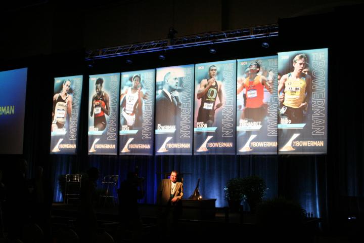 Here is a link to information regarding the ceremonies that occured, and the videos associated with the event: USTFCCCA Press Release (includes additional photos/videos) Bowerman Award Winners Speeches: Galen Rupp - Jenny Barringer Bowerman Award Athlete Introductions: Walking in - Jenny Barringer - Destinee Hooker - Porscha Lucas - Ashton Eaton - German Fernandez - Galen Rupp Hall of Fame Inductees: Duane Vandenbusche - Chuck Rowe - Franklin "Pitch" Johnson, Sr. - Oscar Moore, Jr. - Art Gulden - Gary Winckler |