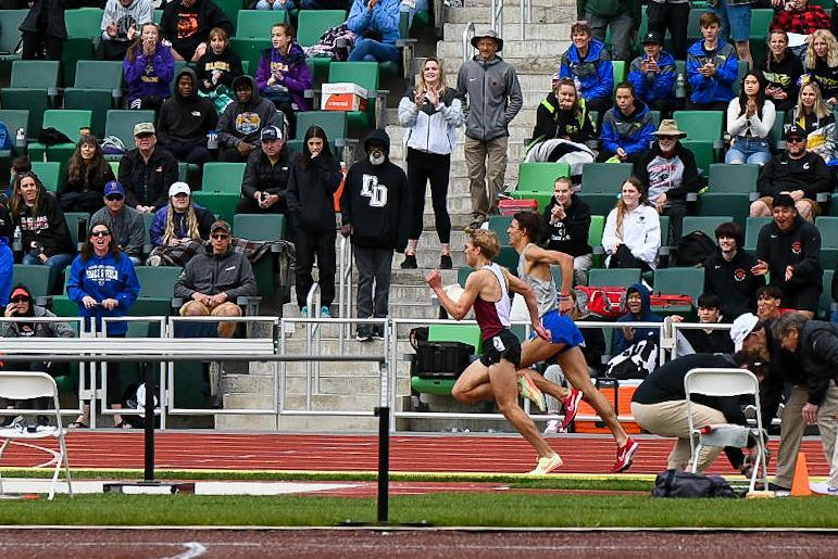 Oregon City's Sophia Beckmon First In State History To Go Past 20 Feet In Long Jump; Caleb Lakeman's Magic Continues As He Catches Michael Maiorano In Final Strides Of 3,000; Emma Gates Take Three Attempts At 6-1.25 In HJ By Doug Binder, DyeStat Editor Photos by Kim Spir and Becky Holbrook EUGENE – Sophia Beckmon's awful series of jumps took an abrupt turn on her sixth and final try Friday at the Oregon state track and field championships at Hawyard Field. The reigning national champion from Oregon City was in danger of not making the finals after a tepid first jump and a foul, and she was still in third place after five jumps. She asked for a Hayward Field slow-clap, remembered all of the people who were pulling for her, and finally got the jump she'd been seeking all year on her final try – 20 feet, 1.50 inches (6.13m). "I wish it was a little bit less stressful," Beckmon said. "Every single one of my jumps felt off and to the point where it had to come up to the last one (to win), which was honestly a lot anxiety and it was kind of scary. "Actually getting 20 feet and feeling the relief of getting my goal, which has been my goal for so long now ... I actually cried." Beckmon's long-sought 20-footer, the first in state history, came after achieving a season's best of 19-11 (6.07m) and a district meet jump of 19-10 (6.04m). It was one of the biggest highlights on a day brimming with record-breaking potential in one of the most highly anticpated state meets Oregon has ever seen. Lake Oswego's Mia Brahe-Pedersen and Roosevelt's Lily Jones qualified safely to Saturday's finals in the 100 and 200 in what could be spectacular final showdown between the two sprinters. Brahe-Pedersen came close to her personal-best time in the 200 by clocking 23.33 in the prelims for a meet record after running 11.66 in the 100 for another. Jones ran a personal-best 23.89 in the 200 and also ran 11.73 in the 100 prelim. In the Class 4A girls high jump, Cascade's Emma Gates made first-attempt bars all the way through 5-feet-11 (1.80m) – higher than the winning jump at last week's Pac-12 Championships – and then had three tantalyzing attempts at an all-time state record of 6-1.25 (1.86m). Gates said her second try at the bar felt like her best. "I'm getting closer and closer, so hopefully sometime soon I'll get that 6-1 mark," she said. "A little more speed, a little more up, hopefully I get it." The morning's 3,000-meter finals featured a deep and loaded field in the 6A boys race that was full of storylines. But it will be remembered for South Meford's Michael Maiorano taking the race out in 61 seconds for the first lap and 4:20 for 1,600, building an enormous lead, and then trying to hang on for dear life. Tualatin's Caleb Lakeman closed with a 58 (to Maiorano's 64) and got to the finish first in 8:13.31. Maiorano gave everything to reach the line in 8:13.58 and fell hard to the track, tearing an inch-deep gash in his knee. Seven boys went under 8:20, including third-place finisher Charlie North of Franklin (8:14.24) and Aiden Smith of Lincoln (8:15.52) and Jacob Nenow of Jesuit (8:16.45). Maiorano's ambitious gambit nearly paid off. And Lakeman, one of his best friends, wasn't sure he could overcome the gap. "Definitely the last 100 is when I thought I've got a real shot of winning this thing," Lakeman said. Maiorano opted for a Prefontaine-esque route, feeling that anything less than a bold all-out effort from the gun was a wasted opportunity. "I don't think winning is winning, for me, if I run for two and a half kilometers and then steal the race in the last 200 yards," Maiorano said. "And that's a great strategy for some people, and that's winning for some people." Last year at the Oregon 6A Showcase, the de facto championship meet put on by coaches, Maiorano went to the front and had two runners go with him for 2,400 meters. Seniors Charlie Robertson and Mateo Althouse ultimately went by him and kicked to first and second. In the girls 6A 3,000, Lake Oswego's Kate Peters rolled to a state meet record with US#3 9:25.15 and came up three-tenths of a second shy of Ella Donaghu's all-time state best. It was Peters' first state track title and she was pushed, a bit, at the end by Franklin's Kaiya Robertson (9:28.72) and Ida B. Wells' Charlotte Richman (9:31.43). Class 3A/2A/1A Catlin Gabel's boys scored 84 points to win the Class 3A championship, getting victories from Josh Widdows (110 hurdles), Mike Hart (800) and the 4x100 and 4x400 relays. Nyssa used a second-place finish in the 4x400 to slingshot ahead of St. Mary's of Medford to win the 3A girls team title, 71.5 to 70. Trevor Angove won the long and triple jumps, and his brother Hunter Angove won the pole vault, as Bandon won the 2A boys title with 56 points. Coquille got a 1-4 finish in the javelin, with Trinidy Blandon taking the victory, on the way to the 2A girls team title. Jace Martin swept the 100 and 200 and was part of two winning relays for Adrian, which won the boys 1A team title with 74 points. The Adrian 4x100 relay ran 43.82, faster than the 2A or 3A winning teams. Addy Martin, Jace's sister, also swept the sprints for Adrian. But Damascus Christian proved to be too deep and beat Adrian 105.5 to 82 for the 1A team title. More news |