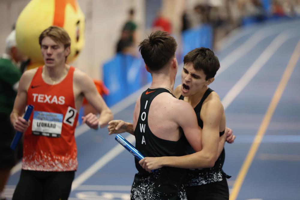 Belen Jesuit FL Junior Wins Mile, Earns Fourth Gold Medal; Texas Sprinters Sweep 60s and 200s; Iowa Wins State DMR By Oliver Hinson of DyeStat Photos by John Nepolitan NEW YORK — With about 100 meters left to go in Sunday’s mile championship at Nike Indoor Nationals, it looked like Marcelo Mantecon’s run of greatness at Nike Indoor Nationals was in danger of ending. As the Belen Jesuit FL junior rounded the final turn at The Armory, he had nearly seven miles of racing in his legs, and a surging Abdinasir Hassan (Northfield CO) charging up from behind. Somehow, Mantecon found the last bit of energy in his body — enough to hold off Hassan and break the tape in 4 minutes, 0.66 seconds for his fourth gold medal of the weekend. No one watching knew where that burst of energy came from — and neither did he. “I wish I could tell you,” Mantecon said. “That came from absolutely nowhere. I pushed my body to its absolute limits.” For context, Mantecon’s weekend of racing is one of the most impressive performances in high school history. On the first three days of the weekend, he ran 13:57.94 in the 5,000 meters, 8:48.02 in the 2 mile and 4:04.73 on the anchor leg of the distance medley relay. All wins. Still, he had enough left to run 1:57.42 for his last 800 meters and 56.39 seconds for his final 400 in Sunday’s race. Looking at his weekend as a whole, there is almost no appropriate historical comparison. In 2011, Lukas Verzbicas won the 1,600, 2 miles and 5,000 at New Balance Nationals Indoor, running 4:10.67, 8:40.70 and 14:06.78. His performance was widely celebrated at the time. Mantecon’s quadruple is unprecedented at a national indoor championships. “It means everything,” Mantecon said. “The best in the country were in every race. Each race had its own personality… it was all tough, but I’m glad to come out on top in each and every one.” Mantecon was already one of the most highly regarded athletes in the country before the weekend, but going into the outdoor season, he has risen to another level. “It does put a target on my back,” Mantecon said. “It just makes me want to work harder to keep that aura.” Texas Stars Showcase Sprint DepthAt the end of the weekend, the Lone Star State prevailed in the state rankings with nearly 300 points scored across 49 events, and that was due in large part to its dominance in the sprint events. Texans swept the top five places in the boys 200 and earned four of the top five spots in the 60. Sophomore Dillon Mitchell (C.E. King TX) took the win in the 60 with a blazing time of 6.61 seconds, just two hundredths of a second off of his U18 world record time of 6.59. Mitchell has arguably the most momentum of any sprinter at the moment. In February, he took seventh at the USATF Indoor Championships, and last weekend he ran a wind-aided 9.88 in the 100 at the Texas A&M Bluebonnet meet. Still, he saw himself as an underdog coming into the weekend. “I promised myself I was gonna win,” Mitchell said. “I couldn’t come out here and lose again. I’ve taken too many losses.” Jake Odey-Jordan (Texas Titans) won the 200 in 20.72 seconds, earning his fourth individual national title as a high schooler. Odey-Jordan moved to Texas after the 2025 season and started training with Tate Taylor (Harlan TX), a three-time high school record holder and fellow Texas Tech commit. Taylor ran 20.46 in last year’s 200 at this meet to break the national record, and coming into this weekend, he looked like the best all-around sprinter in the country. He had broken the high school record in the 300 in January, running 32.45, and hadn’t lost a race longer than 60 meters all season. Odey-Jordan knew he was just as capable of a national title, though, and he took his opportunity to earn it. “I knew it was gonna be a fair race,” Odey-Jordan said. Iowa Caps Off Weekend With Thrilling Win In State DMRQuentin Nauman (Epworth Western Dubuque IA) saved his best work for the end of the weekend, fending off Texas’s Caden Leonard (Southlake Carroll TX) and anchoring his Iowa squad to a win in the boys state distance medley relay with a 1,600-meter split of 4:03.30. The Iowa team, consisting of Caleb Ten Pas, Kolby Hodenfield, Jack Meggison and Nauman ran 9:46.23 for the win. Ten Pas, Hodenfield and Meggison split 2:57.97, 49.84 and 1:55.13, respectively, giving Nauman a lead of over three seconds when he took the baton. Nauman, coming off a disappointing 14th place finish in the 800 on Saturday, looked like he was fading in the last few laps as Leonard made up ground at a furious pace. Leonard and Cooper Lutkenhaus created the idea of the “all-star state DMR” — a relay consisting of a state’s best four runners — and the Southlake Carroll senior certainly didn’t want to lose at his own game. He was able to make up about three seconds on Nauman during his leg, but his effort was too little, too late. Texas finished second in 9:46.98. As Nauman barreled down the home stretch, he only had one thought: “win it for the boys.” He had created the squad over the last several weeks, reaching out to associates to get in touch with the Hawkeye State’s fastest runners. All four came in with a mission to put Iowa on the map. Ten Pas, in fact, was originally going to compete at New Balance Nationals Indoor in Boston this weekend, but when Nauman told him about the state DMR, he knew he had to come to New York. “I had to flip over to get the state win,” Ten Pas said. “I feel like Iowa is so underrated. I mean, I went 4:03 (in the mile) at our state meet and didn’t win last year.” The time of 9:46.23 is faster than the indoor high school record time that Belen Jesuit FL set on Saturday (9:47.01), but because the four of them are from different schools, that time means nothing for record purposes. It does, however, send a strong message. In a race with historically strong running states like Texas, Florida, Oregon and Colorado, 