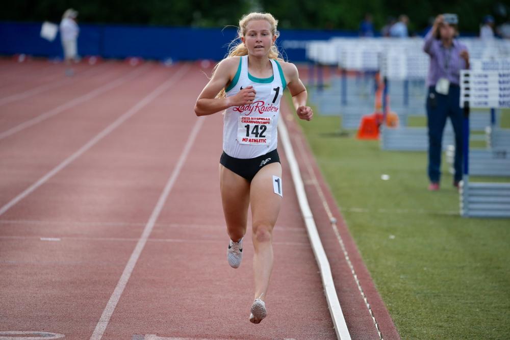 Katelyn Tuohy Runs US#2 9:21.90 To Win 3K; Rylar Gould Goes US#1 51.81 in the 400m Hurdles By Doug Binder, DyeStat Editor Katelyn Tuohy of North Rockland won the New York state title in the 3,000 meters, but she didn’t return to the meet for the 1,500 and her outlook on New Balance Nationals Outdoor remains in some doubt. Tuohy was reportedly suffering from a sinus infection. She ran US#2 9:21.90 to win the 3,000 and beat Saratoga Springs senior and runner-up Kelsey Chmiel by 15 seconds. Matthew Payamps of St. Anthony’s kicked past defending champion Shea Weilbaker of Saratoga Springs in a replay of their 3,200 meters race at the Loucks Games. Payamps dipped under nine minutes with a finish time of 8:59.04. PHOTOS by John Nepolitan - DAY ONE | DAY TWO In the boys 3,000-meter steeplechase, national leader Parker Stokes of Maine-Endwell lowered his US#1 time to 9:02.48. Sarah Trainor of Franklin D. Roosevelt, who broke the national record in the 2K steeplechase in early May, won the state title with 6:31.59 – the sixth-fastest performance in prep history. Kenneth Wei won the long jump and added the 110-meter hurdles (13.86) to lead Mount Sinai to the boys Federation title. The Paul Robeson girls won the 4x100 relay in 46.74 on the way to the Federation team crown. Scarsdale lived up to its billing as the boys 4x800 relay favorite, running a season-best time of 7:43.59 to hold off fast-charging Bronxville team that went from fifth to second and crossed the finish line in 7:45.67. In the girls 4x800 relay, Fayettevile-Manlius, the Penn Relays champs, outdueled Corning and came away with a close 9:04.69 to 9:05.54 win. Penn Relays champion and defending state champion Rylar Gould (Newburgh Free Academy) rallied from behind to hold off Sean Hewitt (Francis Lewis) for the Division 1 title as the two runners posted the first times under 52 seconds in the country this year. Gould ran 51.81 for a new meet record and Hewitt ran 51.85. In the Federation final, Gould false-started and Hewitt won it in 52.98. In the boys 800 meters, Johann Matzal (Faith Heritage) took the early lead and held it to the finish, holding off the kick of Bronxville’s Matt Rizzo and pulling an upset with a personal best 1:52.01. Rizzo was second in 1:52.07. Lindsey Butler of Corning led four girls under 2:10 in the 800 meters, running US#9 2:06.88 for the win. Anthony Harrison of Ramapo threw 197-7 for a dominant win in the boys discus throw and returned to claim the Federation title. He finished third in the shot put. Kwamere White of Henninger won the boys high jump at 6-7. Shane Racey (Ravena) cleared 16 feet to win the boys pole vault. Kaeli Thompson (Warwick) made 13 feet for the girls title. Seventh-grader Jada Kenner of Tapestry, just 12 years old, won the Federation sprint titles, taking the girls 100 meters in 11.90 and the 200 in 23.83 seconds. Jason Robinson of Westmoreland took two titles in wheelchair races, winning the 800 meters in 1:47 and then the 3,200 in a fast 7:36.13 for a meet record. Federation Team Scores – RESULTS Boys champion – Mount Sinai 26 points Girls champion – Paul Robeson 30 points