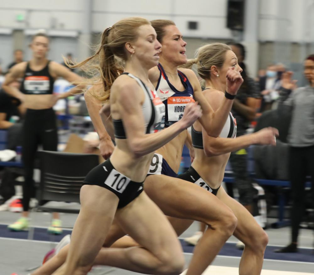 Olympians Hocker, Nilsen, Harrison, Burks and MacLean Win Indoor Titles; Hawkins Comes Up Big In Pentathlon By Doug Binder, DyeStat Editor SPOKANE, Wash. -- After missing the Olympic Games by one spot at the U.S. Trials, Maggie Ewen, to her credit, finished the summer of 2021 on an uptick. That trend continued on Saturday at the USATF Indoor Championships Presented by BD, where Ewen crushed her own personal best by 10 inches and took over the world lead in the women's shot put. VIEWING INFO | RESULTS | INTERVIEWS | PHOTOS by Kim Spir Ewen's victory was a highlight on Day One at The Podium, where a nearly full grandstand saw seven national champions crowned. A sellout crowd is expected for Sunday's session. "It's exactly what I wanted to come and do," Ewen said after her second attempt traveled 64 feet, 11.25 inches (19.79m). "I didn't realize I was going to do it so big, but I'm very happy." The top two finishers in every event qualify for the U.S. team that is scheduled to compete at the World Athletics Indoor Championships next month in Belgrade, Serbia. It's too early to tell whether the Russian invasion Ukraine over the past few days will put that championship in jeopardy. For now, athletes competing in Spokane are trying to win the first available indoor national championships since 2020 and hoping for a chance to represent the country. Chris Nilsen, who won the men's pole vault and took three attempts at an American indoor record height of 6.03m (19-9.25), said he trust that the right decision will be made to protect athletes' safety. "The governing bodies will let things fall where they fall. I think when it comes to the safety of it all people are going to take the precautions that they need," Nilsen said. "It's kind of the same thing as COVID. We have something going on and we need to work around that." Nilsen, the Olympic silver medalist, cleared 19-4.75 (5.91m) as an entertained crowd cheered him on. His victory came as five U.S. men cleared 19 feet in the same meet for the first time in history. And Sam Kendricks, who had not missed a U.S. team since 2014, did not compete. KC Lightfoot finished second with 19-2.75 (5.86m) to earn the second team slot. Cole Hocker zipped through the final lap of the 3,000 meters in 26.6 seconds and separated from Emmanuel Bor and the rest of the field to win his first U.S. indoor crown in 7:47.50. Hocker is set to compete in the 1,500 on Sunday. His former college teammate and training partner, Cooper Teare, was not able to compete because of a positive COVID test. An early suprise came in the women's 1,500 meters, where three women crashed the finish tape within .05 seconds. Olympian Heather MacLean beat her New Balance training partner Elle Purrier-St. Pierre for the first time, and also overtook Josette Norris in the final strides to finish in 4:06.09. Afterward, MacLean revealed she had an organ surgically removed last fall, but offered no explanation of "which one." Purrier-St. Pierre, who seemed like a relatively safe bet, was the odd woman out and missed a top-two spot by .01 seconds. Chari Hawkins, a multi-athlete with an enormous social media following, enjoyed one of the best days of her career in the pentathlon. She scored new personal bests in the first three events of the day -- the 60-meter hurdles, the high jump (tied her best) and shot put -- and perfomed well enough in the long jump and 800 to defeat Olympian Kendell Williams for the national title with 4,492 points. Hawkins recovered from an ankle surgery and the disappointment of a sixth-place finish in the heptathlon at the U.S. Trials. After that, she revaled that she fell into a dark space mentally, she said. "To come back and get a huge personal best and feel like I still have a lot more in the tank is such a beautiful feeling and I'm so proud of myself," Hawkins said. Williams finished second with 4,399 points, but other than long jump mark of 21-0, was slightly off her game. JuVaughn Harrison won the first of a possible two titles this weekend by winning the high jump with 7-5.75 (2.28m). Darryl Sullivan Jr. edged out Darius Carbin for second as both made 7-4.50 (2.25m). Quanesha Burks hit a big mark in the fourth round of the long jump, 21-6 (6.55m). which withstood pressure in the final rounds from Tiffany Flynn and Sha'Keela Saunders for the title. The three jumpers were separated by less than three inches. UPDATE (2/27): Donavan Brazier was flagged by officials for a lane violation after winning his heat of the men's 400 meters but then appealed the ruling and was reinstated for Sunday's final. More news |