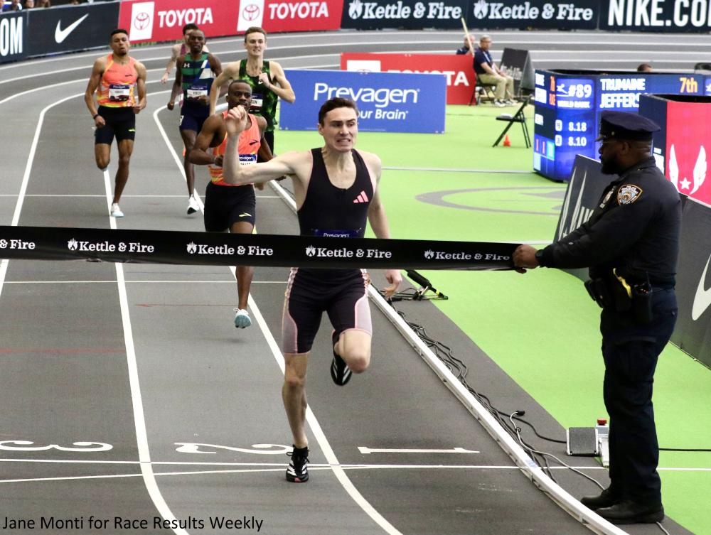 PHOTO: Hobbs Kessler winning the 2025 USATF Indoor Championships 1500m (photo by Jane Monti for Race Results Weekly)