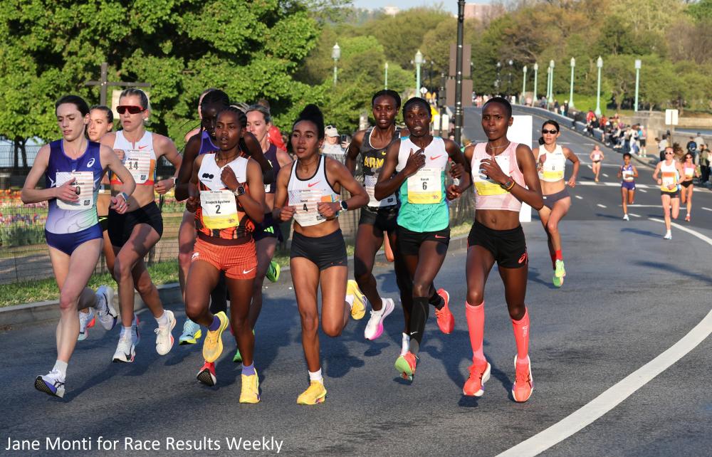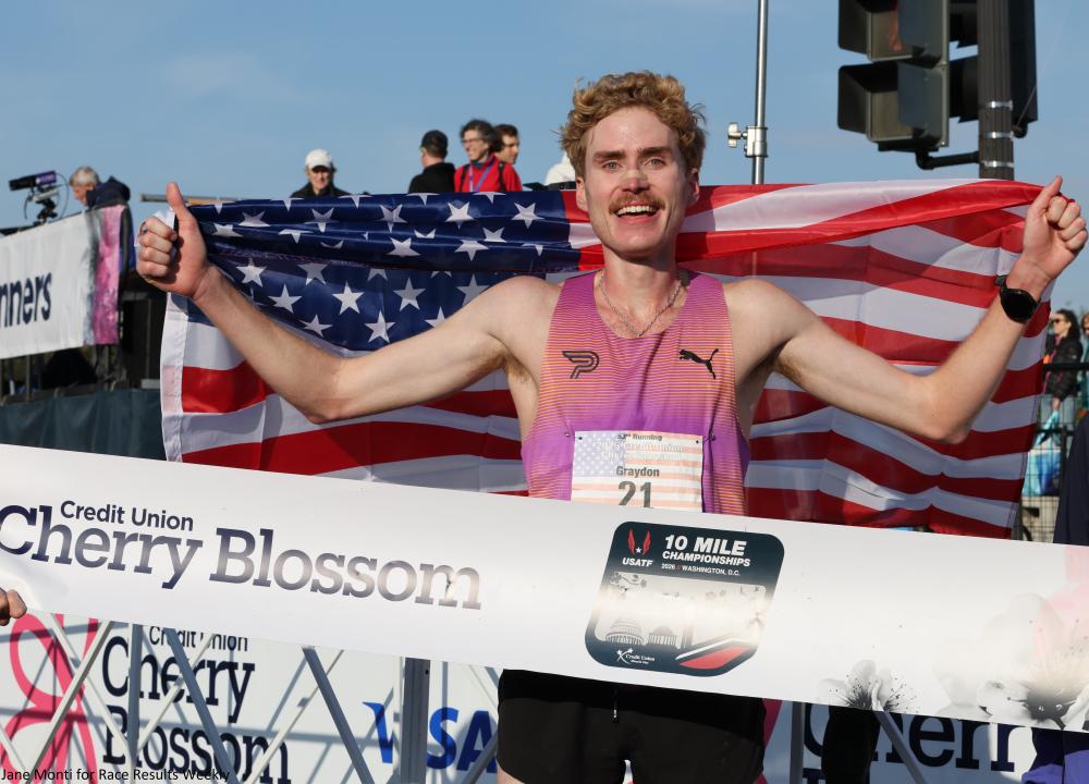 HURLEY, MORRIS TAKE USATF TITLES AT CREDIT UNION CHERRY BLOSSOM 10 MILE By David Monti, @d9monti (c) 2026 Race Results Weekly, all rights reserved - Used with permission. WASHINGTON, D.C. (12-Apr) -- Emma Grace Hurley (Asics) and Graydon Morris (Puma Elite Running) captured the USATF 10-Mile national titles this morning at the 53rd running of the Credit Union Cherry Blossom 10 Mile here in the nation's capital. In sunny but slightly chilly weather, the two Americans nearly won the overall race titles, too, which went to Ethiopia's Asayech Ayichew (Nike) for the women and Morocco's Mohammed El Youssfi (Nike) for the men. All four winners set personal best times, but no American or race records were broken. WOMEN MORE CONSERVATIVE THIS YEAR Unlike last year when American Taylor Roe (Puma Elite Running) ripped the first two miles in 5:04 and 4:58, respectively, the women took a more measured approach this year. The first mile was run in a solid 5:10, and after crossing the Potomac River on the Memorial Bridge, the second mile was an even slower 5:16. That pace wasn't fast enough to drop any of the top contenders, and a big lead pack of 16 women made it to the 5-K mark in 16:09. Hurley, 28, who two weeks ago set a national record for 8 km on the road, was right in the front. She came into today's race hungry for a national title, something that has eluded her despite several podium finishes over the last three years. She was ready for multiple race scenarios. "I really thought it would go out a little faster with the really high quality international talent here," Hurley said, referring to Ethiopia's Ayichew, Uganda's Joy Cheptoyek (Asics), and Kenya's Everlyn Kemboi (Unattached). "I was prepared for anything." Also up in front was USA half-marathon record holder Weini Kelati (Nike) and two-time USA Olympian Karissa Schweizer (Nike Swoosh TC). Kelati had the fastest 10-mile personal best in the field (50:05), and Schweizer --who was running the longest race of her life-- had run 30:18 for 10,000m. The three American women were keeping a close eye on each other. "Emma was brave," Kelati told Race Results Weekly. "She was brave out there running up front." The first important move came in the fourth mile when Ayichew notched the pace down to 5:05. While more of a gentle acceleration, it was enough to drop several women including American Biruktayit Degefa. Things settled back to a 5:13 in mile 5 (running time of 25:56), but then Ayichew decided to push again. She ran 4:56 for mile-6 and 31:57 through 10-K. That was fast enough to cut the field down to six: Ayichew, Cheptoyek, Kemboi, Kelati, Hurley and Schweizer. Molly Born was about 10 seconds back in seventh place. "It was just like, kind of slows down and picks up," said Kelati, who prefers a hard, steady pace. "When the race goes out fast I feel more comfortable than the slower pace." A 4:58 eighth mile --again with Ayichew on the front-- was too much for Kemboi who fell back (she would finish sixth). There was a little bit of a headwind at that point, but Hurley took the lead anyway. "When the race went out slow I was prepared to have a pretty steep pick-up at the end," Hurley explained. "It felt good. It was kind of 'Scenario B' in my head, and I was happy with it." Approaching the 9-mile and 15-K points, Kelati made her bid for victory. A 4:57 ninth mile was too hot for Schweizer, and she decided to drift back (she would finish fifth/third American in 50:55). Ayichew, Cheptoyek, and Hurley stayed close to Kelati for the final twisting, and slightly hilly, kilometer of the race. "I thought Weini was going to win," said Hurley. But Ayichew had other ideas. She hit the gas and ran the final kilometer in 2:58 to take the win in 50:37, good for $7000 in prize and bonus money. "My goal from the very beginning was to make it extremely high-paced," said Ayichew through an interpreter. "I was actually aiming for the course record. Unfortunately, that did not work out and as the kilometers increased I kept increasing the pace." Cheptoyek, the Ugandan, took second in 50:41 with Hurley right on her heels in a personal best 50:42. Kelati was fourth overall (second American) in 50:46. Hurley was delighted to win her first national title. She got the extra benefit of doing it at an event where her kit sponsor, Asics, is a prominent sponsor, and their North American CEO, Koichiro Kodama, was at the finish line to greet her. "Oh man, I really wanted to win," said Hurley, who won a total of $12,000 in prize and bonus money. "I've never won a USATF race before. I've been second and third many, many times. You know, I was prepared to get second but I really wanted to win." Schweizer, a track specialist, was jazzed about her performance. "That was so fun," Schweizer told Race Results Weekly. "Like, I just feel like there is so much energy out there, and I was definitely a little scared of the distance. It just felt a little intimidating, but I just felt very relaxed throughout most of it." MEN NOT IN A HURRY, EITHER The men didn't start aggressively, either. Benjamin Eidenschink (On) was the nominal leader at 5-K in 14:36, according to the official timing data. However, there were 25 men within two seconds of that mark. The pack was a similar size at 10-K (29:21), and Morris was tucked in among the leaders. The twin brother of miler Gracie Morris, the runner-up at the 2026 USATF Indoor Championships, he came into the race with both his confidence and fitness at a high level. "From the gun I just settled into a rhythm," Morris told Race Results Weekly. "It felt like I was on a tempo run. I was very relaxed the whole time." The race really didn't break up until the final mile. El Youssfi, Morris, American Cole Sprout, and U.S.-based Thai Kieran Tuntivate occupied the first four spots. Morris made a bold move. "I made a pretty big move with like a mile and a half to go," Morris told Race Results Weekly. "I was like, I don't know if it's going to work or not, b