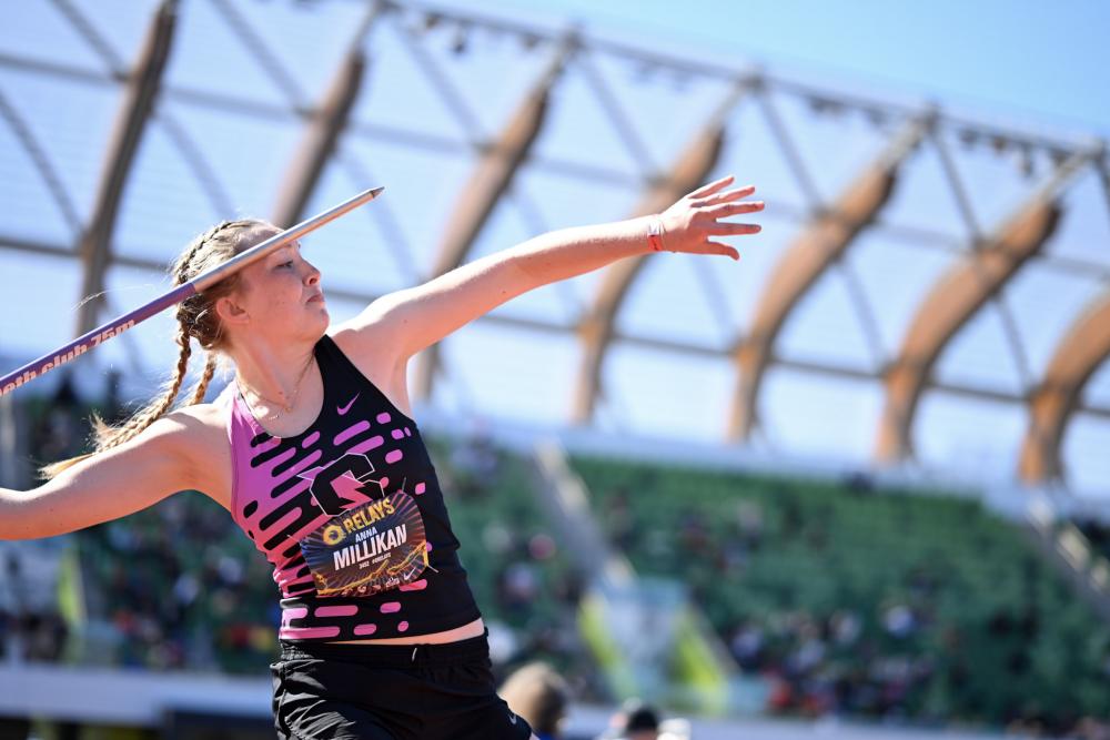 Jones Completes 100/200 For Third Straight Year, Leaves With Nine Oregon Relays Victories: Niwot Boys Go 1-2-3 In Mile; Addison Ritzenhein Dominates Girls Race By Doug Binder, DyeStat Editor DyeStat Photos EUGENE – Aster Jones concluded her Oregon Relays career on Saturday at Hayward Field with grand total of nine wins. The UCLA-bound senior from Roosevelt High of North Portland completed her third consecutive 100/200 sprint double with a pair of races six and half hours apart. WATCH THE OREGON RELAYS PRESENTED BY ANET LIVE ON FRIDAY AND SATURDAY ON RUNNERSPACE+ Just after noon, Jones won the 200 meters in 23.36 seconds near her lifetime best of 23.17 from last year. In the evening, she ran 11.61, which fell a bit short of her expectations. Jones also won the Freshman 100 and was part of two 800-meter sprint medley victories with her Roughriders teammates. Friday’s full day of action culminated with back-to-back wins for Niwot CO in the miles. Addison Ritzehein charged out ahead of the girls field and won in 4:45.73 for an early US#3 performance as nine girls ran under five minutes. Ruby Ihmels from Century SD was second in 4:49.53 and Kjirsten Ludeman of Sehome WA was third in 4:50.26. An exciting boys race featuring four members of Niwot’s Nike Cross Nationals championship team capped the meet. After junior Quinn Sullivan appeared to have separated permanently from the field with 300 meters to go, senior teammate Rocco Culpepper somehow managed to close the gap over the final 100 meters. Culpepper seized and opening pipped his teammate on the inside right at the finish line, winning in US#2 4:05.95 to 4:05.97. Niwot senior Hunter Robbie made his way up from the back for the field and finished with a 58-second last lap to take third in 4:08.71. South Eugene OR’s Yosuke Shibata was fourth in 4:09.97. And a fourth Niwot runner, freshman Jude Ritzenhein, ran 4:11.77 for 11th. Wilson of Long Beach, the three-time defending co-ed team champion, swept the 4x400 relays with meet record performances. The boys ran 3:13.89 and now own the top seven performances in meet history. The girls lowered the meet record by six seconds with 3:41.43 and won by 14 seconds. Wilson has totaled 74 points already and Niwot is second with 50. Boise ID, the 2022 team champion, is third with 48. Sheldon OR's Malachi Schoenherr made a big move with 1,200 to go and kicked to victory in the boys 2-mile in a time of 8:53.74. That was his first win at Oregon Relays since winning the Freshman 2-Mile in 2023. Cassidy Armstrong of Ballard WA left the field behind in the girls 2-mile and won in a time of 10:24.54. Olympia WA pulled off one of the biggest upsets of the meet so far when anchor leg Caden Durocher split 1:52 to close a seemingly insurmountable gap and chased down Wilson CA around the final turn in the 1,600-meter sprint medley relay. Both schools went under the meet record time, but Olympia won it in 3:28.47, a US#1. The Wilson girls put together a second relay victory in the evening session when they ran US#2 4:01.54 in the SMR. Hard-charging Ellery Lincoln of Lincoln OR split 2:06 but ran out of space to catch Wilson and crossed the line in US#6 4:03.90. Kimberly Beard of King's WA broke the meet record in the girls hammer with a distance of 191 feet. That snapped a 10-year-old record by Camryn Rogers. Freshman Rikiah Griffin of Caldera OR made a spectacular debut at the meet. She jumped 19-6.50 on her first attempt to win the girls long jump and then won the freshman 100 meters in 12.14. Both were personal bests. Later, she returned to race in the championship 100 meters and finished fourth in 12.06. Marcus Burton of Tigard OR won the boys 100 meters in 10.62. Jakobe Davis from Vallivue ID ran a big PR of 47.81 to win the boys 400 meters. Wilson's Clara Adams won the girls 400 in 55.18. In both races, the top seed was a scratch. Eddie Bruner Jr of Lincoln WA sat out with a tender hamstring and defending girls champion Sophia Castaneda of Newberg OR also scratched. Dredyn Sharlow from Bethel WA won the boys 200 meters in 21.39. Friday morning, Aidan Wendring of Central OR overcame a fall to defend his title in the 2,000-meter steeplechase (US#2 6:03.87) and Madison Zemper-Prill of South Eugene won the girls race (7:15.33). Summit's Anna Millikan threw a US#1 mark of 160-8 to win the girls javelin. Yevhen Zhmailo of Lake Washington jumped 24-3 to win the long jump. He'll contest his best event, the triple jump, on Saturday. Gursher Gabri of Enver Creek BC won the boys hammer with 207-5. Simon Rosselli of Mead won the boys shot put with US#3 65 feet. More news |