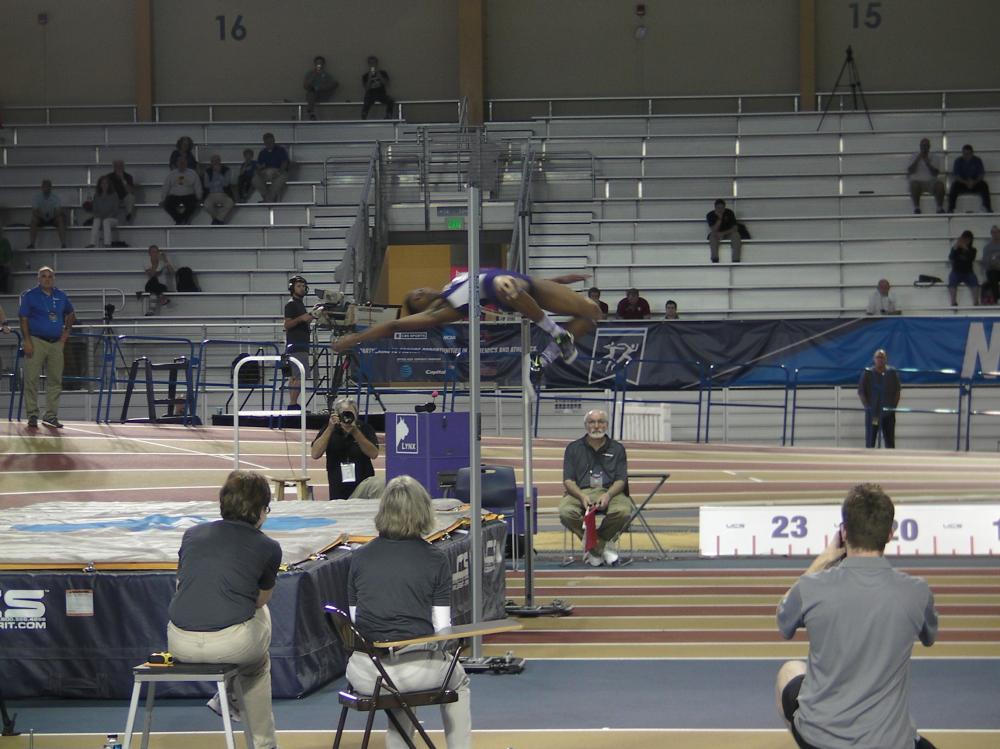 Despite tripping over the final hurdle in the 60 meter hurdles, senior Akela Jones bounced back in the high jump in impressive fashion, falling just one centimeter short of the indoor world record with a personal-best mark of 1.98m/6-06.00. The mark also set a new school record, breaking the previous record of 1.96m/6-05.00 set by Gwen Wentland in 1995.