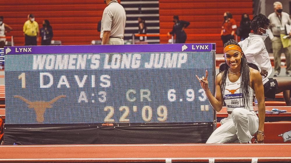 Long Jump Final Tara Davis of Texas, ranked No. 3 coming in, threw down lifetimes bests in the second and third rounds and her leap of 22-9 (6.93m) was a massive best and collegiate record. She didn't need to jump after her third jump as the record mark held up to win by close to a foot. It moved Davis to No. 6 on the all-time American list and 36th in the world. With eight jumpers over 21 feet, it was the deepest competition in the history of the NCAA Indoor Championships. Claire Bryant from Florida moved from fourth to second on her sixth attempt, going 21-11.75 (6.70m) for a new personal best. Tyra Gittens of Texas A&M, already a double winner, collected six more points for the Aggies with her third place jump of 21-11 (6.88m), another personal best. Gittens' 26 points are the third most in meet history, following Carlette Guidry's 30.5 in 1998 and Elva Goulbourne's 28 in 2003. WINNER: Tara Davis, Texas, 22-9 (6.93m) What She Said: "It feels amazing. Like I said, it's been a long time coming. Ups and downs, injuries all over the place, and I finally got the jump that I've been wishing for and praying for, and it just feels good to be a collegiate record holder and to even touch 22 feet again." On how workouts had been going since Big 12 Championships and what gave her the indications that big jumps were coming: