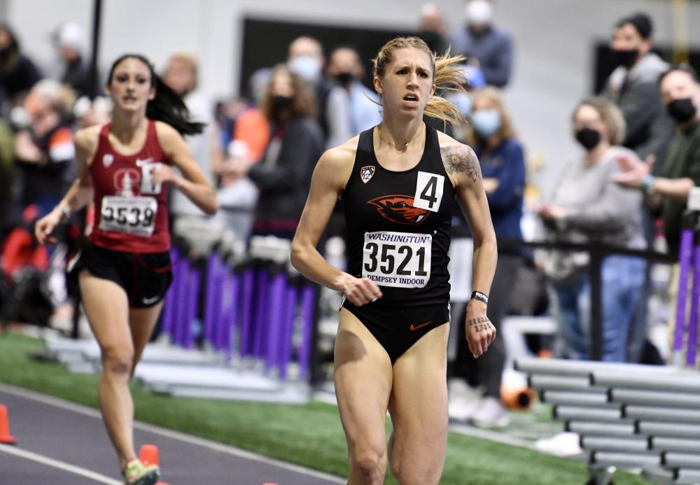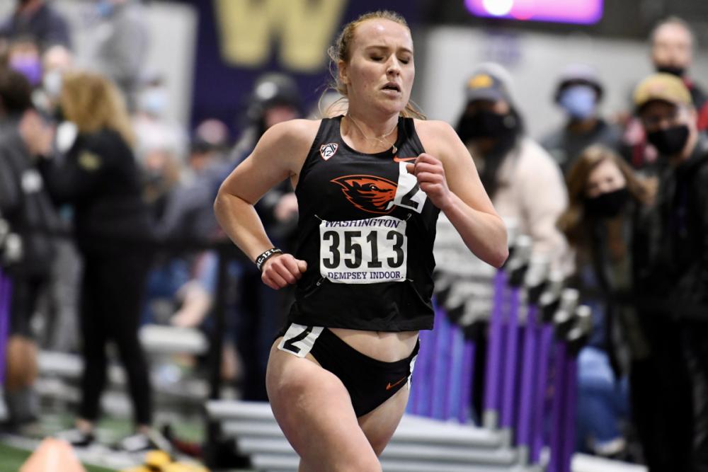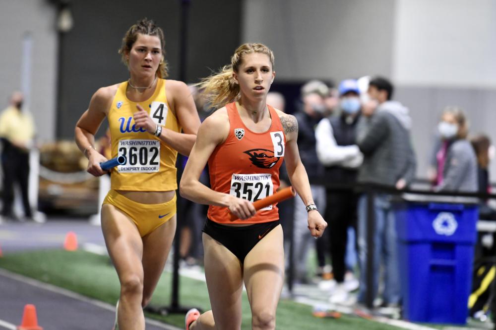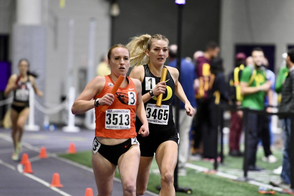 School Record-Smashing Efforts in DMR, 3,000m at Pac-12 Invitational Have Given Beavers Rare Opportunity at NCAA Indoors By Joe Zochert for DyeStat Walking out of the Husky Indoor Invitational on Feb. 12, Oregon State head coach Louie Quintana asked his runners what they thought about putting a distance medley relay together. “I think we have the pieces for a DMR. What do you guys think?” Quintana remembered asking. The members of the team — Kaylee Mitchell (1,200 leg), Adael Scatena (400), Mari Friedman (800) and Grace Fetherstonhaugh (1,600) — were up for it. Two weeks later and back at the Dempsey Indoor facility in Seattle, the Beavers put eveything together in a hotly competitive race with Oregon and Stanford and took second at the Pac-12 Indoor Invitational in 10:57.35. That performance broke the school record by nearly half a minute and moved the squad into the top six nationally entering the NCAA Division 1 Indoor Championships on March 11-12 at the Crossplex in Birmingham, Ala. Not only has OSU never qualified a DMR for the nationals before, the women's-only program has not scored at the indoor meet since 1984, when Carina Westover took sixth in the high jump.