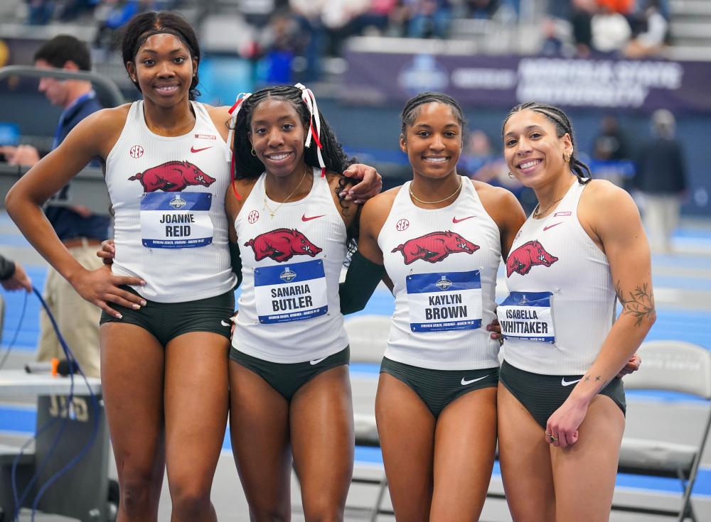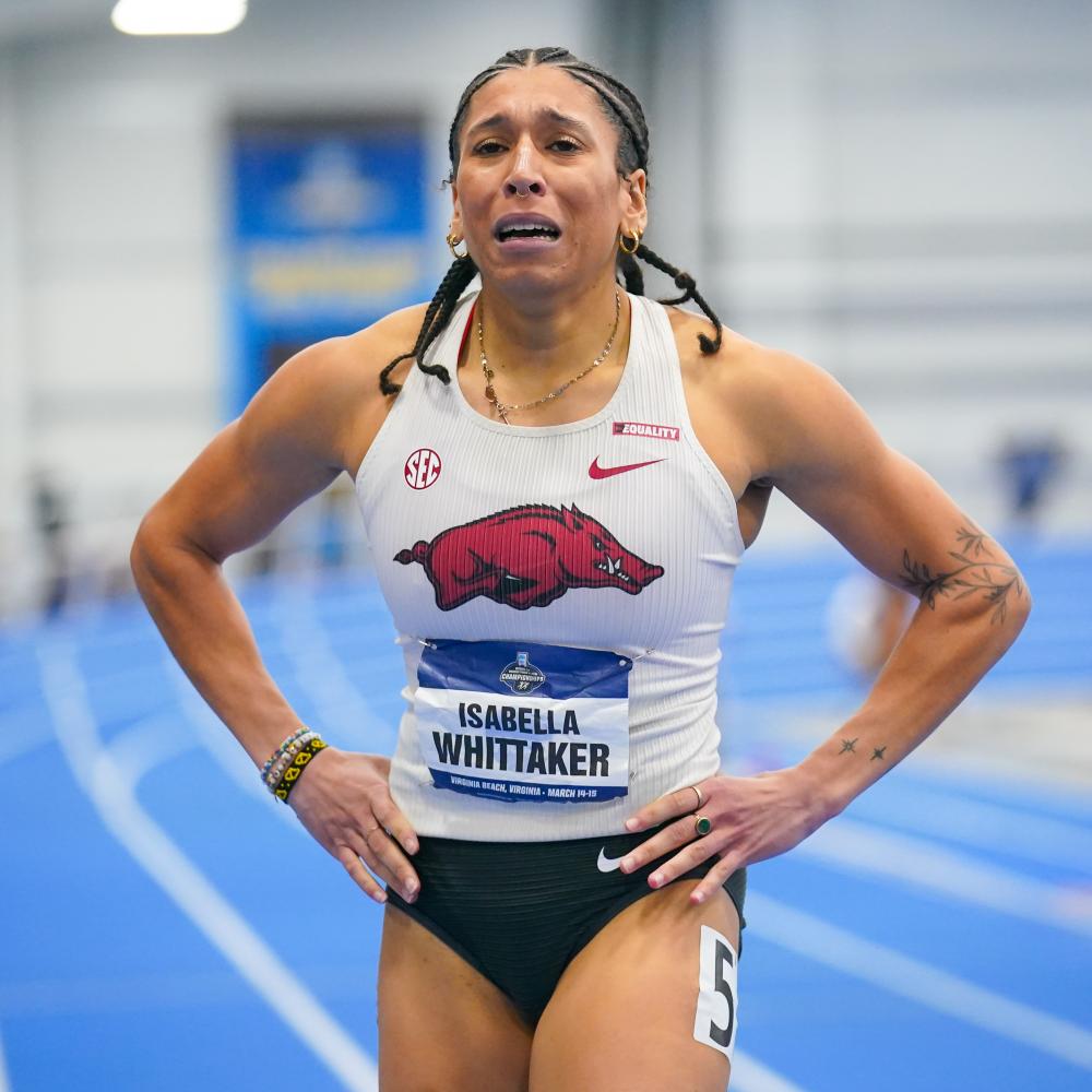 Arkansas Champion Runs 49.24, Second Only To Femke Bol's WR, And Then Closes The Meet By Anchoring Winning 4x400 By Emma Zawatski for DyeStat Tavan Smith photos VIRGINIA BEACH - Isabella Whittaker left the crowd at the Virginia Beach Sports Center in amazement after running a collegiate and American record on Saturday in the 400 meters at the NCAA D1 Indoor Championships. “I knew it was fast because I could feel the energy of the people in the stands,” Whittaker said. She left no question that she would be the one to bring home the national title in the first of two sections of the 400-meter final when she ran a blazing time of 49.24 seconds. The Arkansas grad student's time is second fastest in world history behind only global superstar Femke Bol of The Netherlands, who ran 49.17 at the World Indoor Championships in Scotland last year. The previous American record was set at the 2023 NCAA Championships by fellow Arkansas Razorback Britton Wilson, who ran 49.48 seconds. Whittaker is close friends with Wilson and is inspired by watching her train in Fayetteville. Whittaker, who was a member of the U.S. relay pool at the Paris Games last summer, toed the line of her 400-meter final knowing it would take something special to outrun 2024 Olympian and University of Georgia sprinter, Aaliyah Butler, who was racing in the second section. After coming through the first lap in 23.81 seconds with the lead, Whittaker continued to widen her gap on the field, finishing more than two seconds ahead of second-place Rachel Joseph of Iowa State (51.58). “When I came through the 200-meter, I was like ‘This is going to be a good one,’” she said. Although she ran a time for the ages, Whittaker was not able to celebrate too early because Butler still had a chance to run even faster. There was nothing she could do except anxiously sit and watch the Olympian take the track. Whittaker told herself: “I left it all out there, so whatever happens, happens.” Butler finished her race a couple of minutes later in 49.97 seconds, officially cementing Whittaker as the national champion. An hour after her historic run, Whittaker doubled back in the 4x400-meter relay as the anchor leg for the Razorbacks. She received the baton one second ahead of University of Georgia’s anchor leg, Butler. This rematch between the two brought fans to their feet as Butler slowly began closing in on Whittaker in the final 200 meters. With the relay team's national championship on the line, Whittaker pushed through the finish line with everything she had. Whittaker closed out the relay with a 49.71-second split, while Butler ran a 49.48-second split. Butler’s faster relay leg was still not enough to secure the win for the Bulldogs. The Razorbacks won in a time of 3:35.20, setting a season's best and facility record. Whittaker,, who starred at UPenn before transferring to Arkansas, is going home victorious with two new national championship trophies, a collegiate record and a national record. “I just want to hold on to this feeling forever,” she said. |