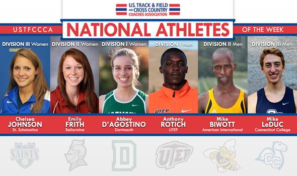 NEW ORLEANS – Neither heat nor rain at many of this past weekend’s major meets across the nation could slow down this week’s National Athletes of the Week, awarded by the U.S. Track & Field and Cross Country Coaches Association (USTFCCCA). Unseasonably warm temperatures at Notre Dame and Lehigh didn’t stop this week’s Division I honorees Anthony Rotich of UTEP and Abbey D’Agostino of Dartmouth. Rotich handled the heat and the nation’s deepest field at Notre Dame in stride en route to the win, while D’Agostino’s burned through the Paul Short field for a 26-second victory. Division II men’s honoree Mike Biwott of American International earns the award for a second time this season after finishing runner-up at Paul Short, while Bellarmine’s Emily Frith took the women’s award following a ninth-place showing at the soggy Greater Louisville Classic — tops among DII competitors. Conditions were also wet in Hanover, Ind., for Division III Pre-Nationals, but the weather couldn’t cool off St. Scholastica’s Chelsea Johnson, who won wire-to-wire for the second straight weekend for a nearly one-minute victory and her second consecutive National Athlete of the Week award. Connecticut College’s Mike LeDuc took the men’s race over a strong field featuring a former National Athlete of the Week to garner the men’s honor. Read the full article at: www.ustfccca.org