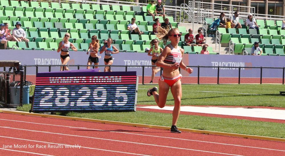 Karissa Schweizer (31:16.52), who finished second in the 5000 earlier in the meet, out-kicked Alicia Monson (31:18.55) for second place, with both women joining Sisson on the Tokyo roster. Even with the heat (33 Celsius/85 Fahrenheit), they all ran faster than the Olympic qualifying standard (31:25.00) — though they didn't need to, having achieved the time in previous races.