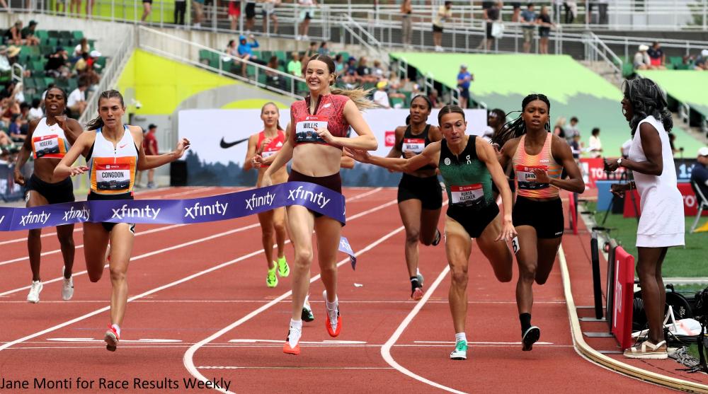 PHOTO: Roisin Willis winning the 800m at the 2025 Toyota USATF Outdoor Track & Field Championships in Eugene, Oregon (Photo by Jane Monti for Race Results Weekly)