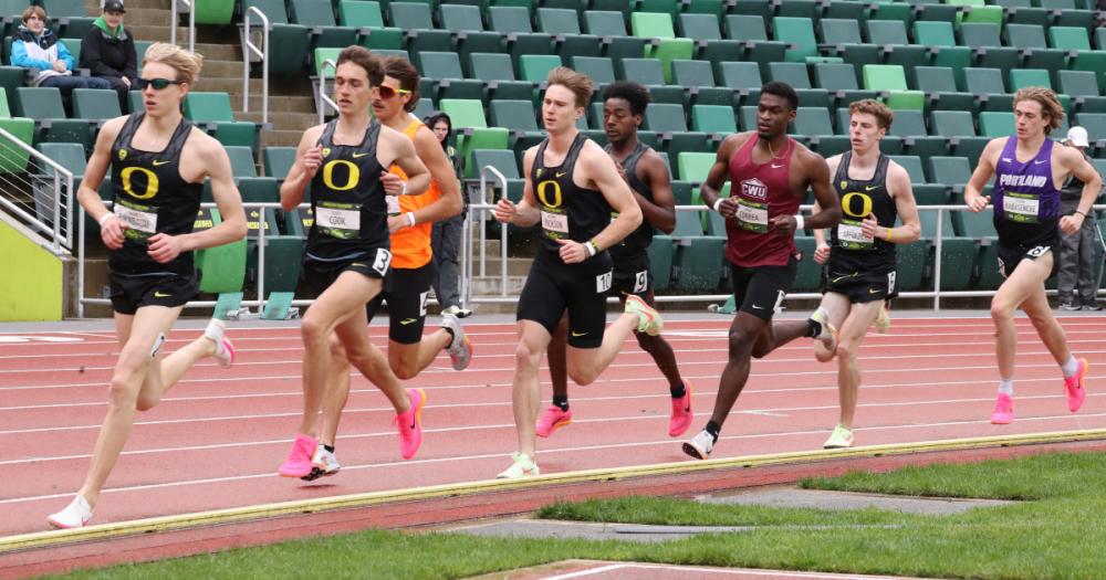On A Day When A Few Newcomers Made Their First Splash For The Ducks, Veteran Elliott Cook Wins Twice By Doug Binder, DyeStat Editor EUGENE – Elliott Cook hadn't raced in more than three and a half months, but the Oregon junior resurfaced at Hayward Field with an impressive double on a cool, damp day at the Oregon Preview. Cook won the 1,500 meters in 3:42.85 for a very early national leading time and then he came back about 90 minutes later for the 800, moving from last to first in the final lap, to win again in 1:50.49. RESULTS | VIDEOS | KIM SPIR PHOTOS | DYLAN DE BALDO PHOTOS "It was a little bit of a rust-buster for sure," Cook said. "But overall I'm pretty happy with the statement that I made for myself." Freshman Simeon Birnbaum, the Track and Field News Boys High School Athlete of 2023, made his debut for the Ducks track team in the 1,500 and finished second in 3:45.27, just ahead of teammate Matthew Erickson, who was third in 3:45.38. Birnbaum admitted it has not been easy staying patient while waiting to get his collegiate racing career started. After an unattached appearance at the Bill Dellinger Cross Country Invitational last September, the sub-four miler from Rapid City Stevens SD redshirted the cross country season and then the indoor track season. "I was excited by extremely nervous (this morning)," Birnbaum said. "This is the longest break I've had between races since maybe when I started running in the sixth grade." Birnbaum was unimpressed with his performance and recalled that he didn't run very fast in the first part of 2023 either. "Sometimes at the beginning of the year I just suck, it's as simple as that," he said. "It's not very good." Birnbaum, who competed at the USATF Outdoor Championships in the men's 1,500 meters last summer, has set high standards for himself. He'll get another opportunity next week, presumably in better weather, at Stanford. Another freshman, Harrison Rheinhardt, served as pacer in both the 1,500 meters and 800 meters and didn't, yet, get a real race in. On the women's side, freshman Ella Thorsett made a strong first impression with a personal best time of 4:28.58 for second place. Thorsett tried to close down a big gap on Portland's Courtney Klatt, who won in 4:28.44. Transfer Samantha McDonnell won her first race at Hayward in an Oregon uniform, taking the 800 in 2:09.06. Oregon's Taylor Chocek ran a PR time of 13.59 for a victory in the women's 100-meter hurdles. In the women's discus, Oregon's Jaida Ross (181-6) and Shelby Moran (169-6) launched some big throws to go 1-2 in the competition. Central Washington's E'lexis Hollis swept the women's sprints and won the 100 meters in 11.77 seconds and the 200 in 24.60, edging out Chocek (24.63). Wakilli Bennett of Dominican (Calif.) won the men's 100 meters in 10.52 seconds.