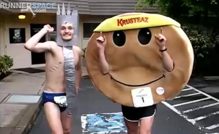 This month’s Monster Runner, Matt Barnhart, stands out in a crowd. Not only is he one of the area’s fastest runners, but he’s always positive, has great energy, and oh yeah, he doesn’t like to wear clothes when he runs. Matt’s running costumes and antics have always attracted attention – check out the pictures of Matt dressed as a fork, as he raced against the Krusteaz pancake (aka Flap Jack) in the recent Eugene Marathon 5K. Matt (the fork) won by the way, cruising to victory in 15 minutes and 28 seconds over the 3.1 mile course. The fork outfit, Matt admits was a bit more than he usually likes to race in – last year, he ran to victory at the Truffle Shuffle 4 Mile wearing a pair of girls running shorts, fashioned into a speedo.