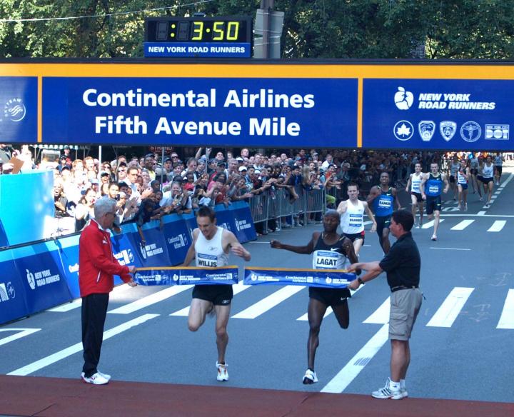 PHOTO: Nick Willis narrowly beats Bernard Lagat at the 2008 Continental Airlines Fifth Avenue Mile (photo by Jonathan Cooper).