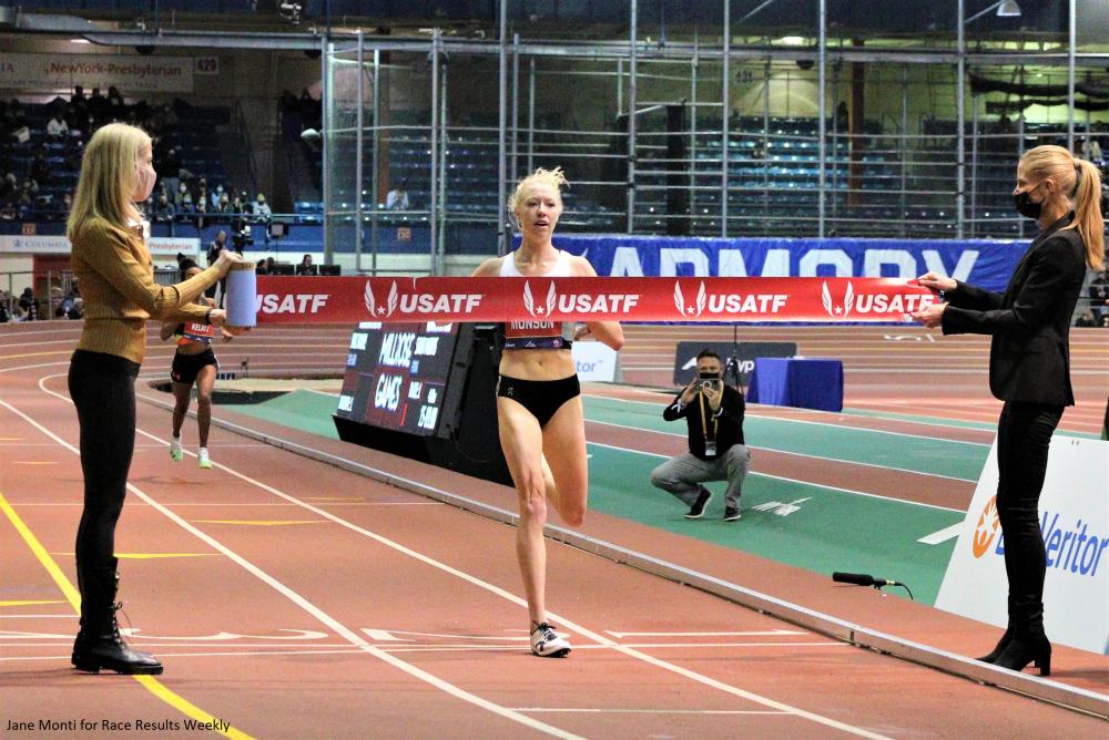 PHOTO: Alicia Monson wins the 3000m at the 2022 Millrose Games (photo by Jane Monti for Race Results Weekly)