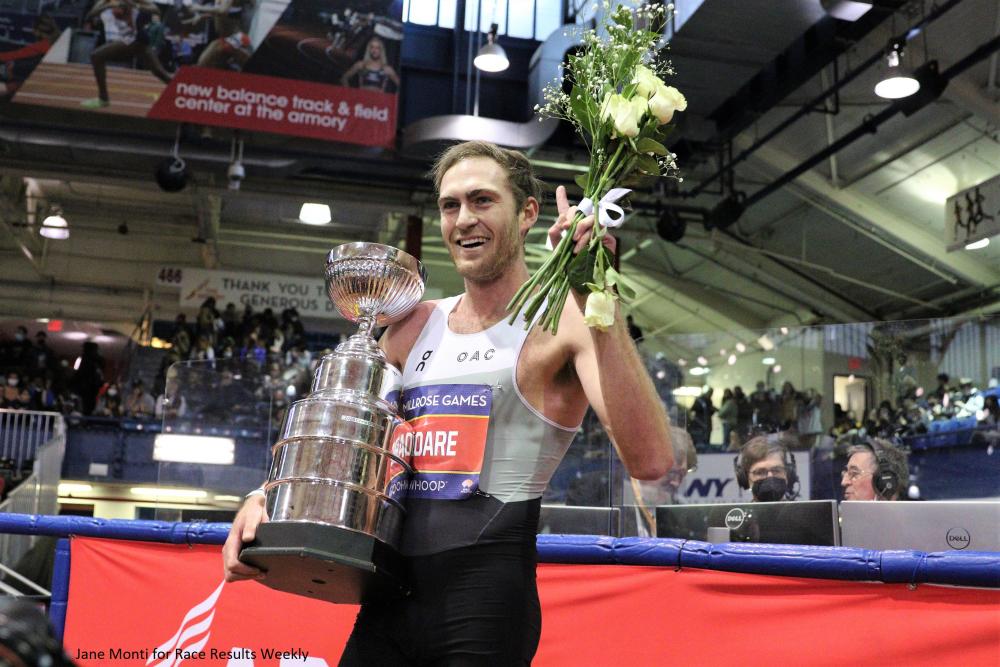 PHOTO: Oliver Hoare holds the winner's trophy for the Wanamaker Mile after running an Australian indoor record of 3:50.83 (photo by Jane Monti for Race Results Weekly)