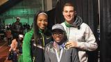 No wasted movement. That’s been Irving’s project with Gabe this season. It’s a result of something she noticed during his acceleration drills: Gabe would take off by driving his arms first, then allowing his legs to catch up. “As soon as your arms go,” she tells him, “I need your legs to go, too, everything in one motion, and shoot out of there like a jet.” Just as she and the other Poly coaches have done with all the athletes on the team — nearly 200 total — Irving drills Gabe on mechanics, form and efficiency. She’s helping him become more comfortable with those starts, too, and educating meet officials on the adjustments needed when Gabe is on the line. “We make them aware,” Irving says, “that on the ‘Set,’ they can’t hold him for up to three seconds like other athletes. They have to make a special accommodation. So, if you’re in the same heat as Gabe, you’re going to get a ‘Set’ and then the gun. No waiting.” Gabe appreciates that accommodation, he knows it’s necessary, but in general he wants to be treated like all the other Poly athletes. Same workouts, same feedback, same hopes for success. Irving recalls a day, shortly before the Arcadia Invitational last year, when Gabe approached to ask if he’d be issued one of the special Poly uniforms that runners receive for big invitationals. He remembered all the color variations Ariana sported, and was hoping for something equally flashy himself. Irving assured him that he’d be taken care of, she’d already pulled a uniform, and he’d look as sharp as all the other varsity athletes. “I said, ‘We got to make sure you look good, Gabe. Because when you look good, you run good.’” Several weeks later, when he finally had that opportunity to race at the CIF State Meet, it was the same arrangement — signature Poly uniforms, prelims and finals. Look good, run good. And although Gabe had never competed in front of a crowd as large as the one at Veteran’s Memorial Stadium in Clovis, he overcame his nerves to place fourth in both the 100- and 400-meter ambulatory events. The first Jackrabbit to ever contest in those events at a state meet. Ariana, no stranger to historic state meet achievements, badly wanted to be in California for Gabe’s post-season debut, but she was at home in Ohio — preparing for the birth of her first child. In 2019, Ariana married fellow Olympian Clayton Murphy; the two had met playing Uno in the athlete village at the 2016 Rio Games. In the fall of 2022, the couple welcomed a baby boy named Cash. Remarkably, Cash was also born early — Ariana hadn’t yet reached her third trimester — and endured a lengthy NICU stay before the Murphys were able to bring him home. And while Cash doesn’t appear to suffer any long-term effects from his premature birth, Ariana can’t help but feel echoes of Gabe’s birth and childhood in her own experience as a young mother. “I always tell people,” she says, laughing, “Gabe was like my first son.” And like any proud parent — or supportive big sister — she was thrilled when Gabe had the chance to represent Poly at the state meet. “It makes me really proud,” she says. “I tried to instill in him, not only through my words but with my actions, that you can do anything you put your mind to. Don’t ever let anyone tell you that you can’t do something. Don’t ever let anyone tell you that you’re less than.”