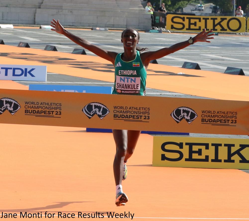 PHOTO: Amane Beriso Shankule of Ethiopia wins the 2023 World Athletics Championships marathon in Budapest in 2:24:23 (photo by Jane Monti for Race Results Weekly)