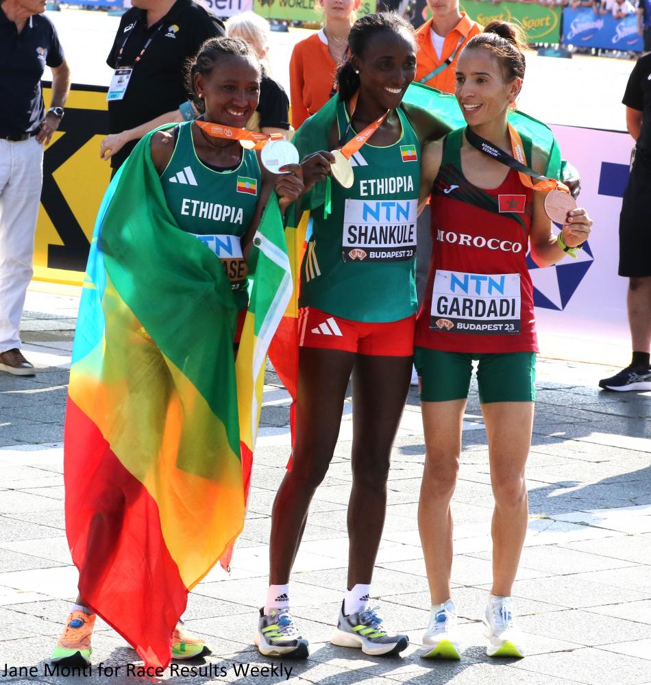 PHOTO: The three women's marathon medalists from the 2023 World Athletics Championships (left to right): Gotytom Gebreslase of Ethiopia (silver), Amane Beriso Shankule of Ethiopia (gold) and Fatima Ezzahra Gardadi of Morocco (bronze) (photo by Jane Monti for Race Results Weekly
