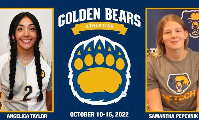 Golden Bear Athletes of the Week for October 10-16, 2022 were announced Thursday by the WVU Tech Athletic Department. Sophomore Angelica Taylor (women's soccer) and freshman Samantha Adele Pepevnik (women's swimming) highlight the week's honors. Read the full article at: goldenbearathletics.com