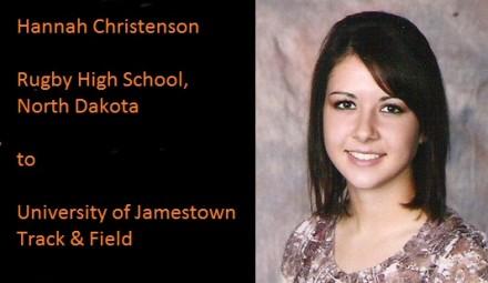 University of Jamestown women's track & field coach, Jim Clark, announced that Hannah Christenson, who will be a 2014 graduate of Rugby High School, signed a North Star Athletic Association Letter of Intent and plans to participate in Track & Field for the Jimmies. Hannah is the daughter of Sarah and Erik Christenson of Rugby. Hannah plans to pursue a Biology major at the University of Jamestown. Read the full article at: www.JimmieAthletics.com