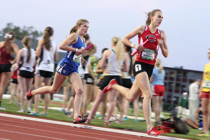 And Efraimson needed every bit of her 4:44 anchor carry to overcome Grant, located in Northeast Portland (across the Columbia River from Camas). Ella Donaghu, who owns the US#1 time in the girls 3,000, split 4:54 but couldn't stay away from Efraimson. Still. Donaghu refused to be put away and only lost by a step. That's the fastest girls DMR by an Oregon team, too, and both teams smashed the meet record.