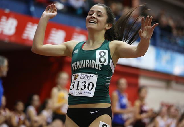 New Balance Track & Field Center at The Armory, December 20th – When Benjamin Cardozo High School graduate Sabrina Southerland headed south to Georgetown University in late summer 2013, she expected the records she left behind to last a while. After all, she was named Armory Girls Track Athlete of the Year and her series of brilliant performances were first-rate. But nothing's ever written in stone in her sport and, just look now, one of her more notable record-breaking performances has already been erased from the books. Southerland's 4:56.25 mile performance at the Bishop Loughlin Games had a shelf-life of just two years. It was shattered Saturday by Pennridge HS senior Marissa Sheva who cruised to a sensational 4:50.73 win at the 61st annual Bishop Loughlin Games, first of the "majors" on the four-month-long Armory winter season. Catherine Pagano of Northern Highlands bettered Southerland's old mile mark, too, but her 4:53.29 clocking sufficed for just second place. Also "breaking 5" was Bella Burda of Arlington HS at 4:59.26 for third place. These were first-class performances and, coming so early in the campaign, are certain omens of even bigger things just ahead. Amazingly, Sheva did all this just one week after concluding a great cross country season. She'd run 25th in the Foot Locker finals December 13th at San Diego's Balboa Park. "This is really exciting for me," said Sheva, "especially coming so soon after cross country." The win made her an automatic qualifier for the NYRR Millrose Games at The Armory on Saturday, Feb. 14, 2015. Further down the road, though, she'll face a very big decision. Sheva is also an outstanding soccer midfielder – starring for the IMG Academy Pennsylvania Fusion team – who has already accepted a Penn State scholarship. So the process of changing shoes – XC to indoor spikes to soccer cleats – is one more matter she'll have to deal with. There were tons of other of outstanding middle distance running highlights at the Loughlin Games, the historic season-opening meet hosted by the Brooklyn school whose own heritage dates back to 1851. Boys and Girls HS sprint phenom Richard Rose surely rose to the occasion, shattering the boys 600m record with a 1:18:40 clocking (46/100 faster than the meet standard) that won it decisively over Clara Barton's Kemani Mighty, who ran 1:21.68. Yet another meet record-smasher, Archbishop Molloy HS triple jumper Jared Lovelace, hopped, stepped and jumped exactly 50 feet (wrecking the Loughlin standard of 48-8 1/2). Put Anna Flynn, James Burke and Stephen Garrett on that list of top performers at the Bishop Loughlin meet, too.