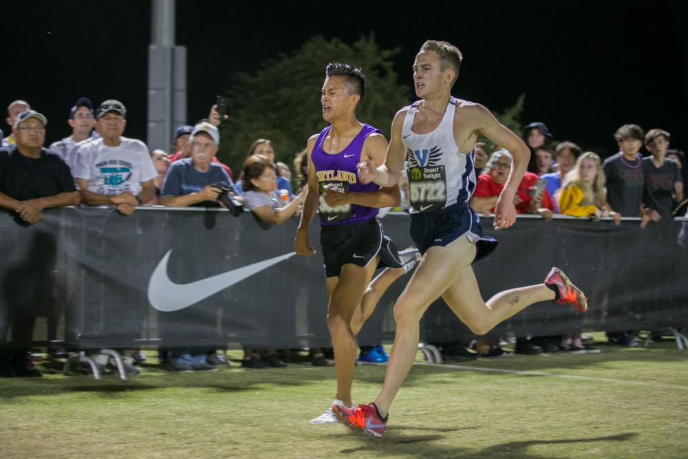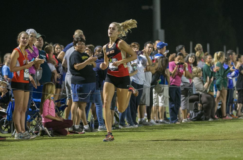 Harrison, Schadler win Twilight sweepstakes races Desert Vista boys, Chandler girls claim team titles at Desert Twilight By Erik Boal, DyeStat Editor Kashon Harrison of Kirtland Central NM and Cole Sprout of Valor Christian CO produced the most thrilling boys sweepstakes finish in the 11-year history of the Desert Twilight Festival. But when it came to the boys team battle Friday at Grande Sports Complex in Casa Grande, Ariz., Desert Vista needed no such heroics. The reigning Arizona Division 1 state champions placed five scorers in the top 29 with an 18-second spread and all seven runners in the top 38 to knock off defending champion El Paso Eastwood TX by a 71-107 margin, securing the Thunder's first sweepstakes title since 2014. Harrison rallied in the final 200 meters to lean ahead of Sprout at the finish to become the first New Mexico athlete to capture an individual sweepstakes championship. Harrison was credited with the victory on the 5-kilometer course in 14 minutes, 48.47 seconds to Sprout's 14:48.54. Since the event was moved from Toka Sticks Golf Course to the layout in Casa Grande, both Harrison and Sprout ran the second- and third-fastest times, trailing only the 14:45.6 by two-time champion Daniel Bernal of El Paso Eastwood TX last year. Chandler put all five scorers in the top 60 -- led by Morgan Foster taking third in 17:44.8 -- to celebrate its first girls sweepstakes championship in program history with a 118-169 win over Durango CO. Desert Vista, seeking its record fifth sweepstakes title, placed sixth at 209. Chandler joined Desert Vista, Xavier College Prep and Mountain View Mesa as girls sweepstakes champions, with Arizona programs winning the title all 11 years. Rio Rico AZ junior Samantha Schadler pulled away from Desert Vista senior Haley Wolf (17:21.6) in the final 400 meters to win the individual sweepstakes title in 17:15.8. Samantha joined older sister Allie Schadler -- last year's winner in 17:03.8 -- as sweepstakes champions, helping Rio Rico become only the second girls team in meet history to have two individuals capture titles. Xavier Prep had Jessica Tonn win in 2009, followed by Sarah Fakler from 2010-12. Northland Prep AZ senior Maya Smith, a three-time Division 4 state champion, won the girls championship race in 17:37.2, the third-fastest female performance of the meet. Boulder Creek AZ senior Jacob Lewis, second last year in the championship race, won the competition in 15:20.2, a top 15 boys time overall. More news |