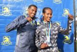 PHOTO: Hagos Gebrhiwet (left) and Buze Diriba after winning the 2018 B.A.A. 5-K in Boston, Mass. (photo by Jane Monti for Race Results Weekly)