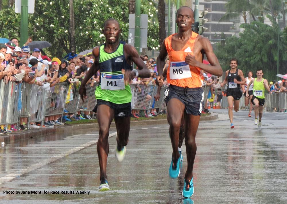 PHOTO: Edward Cheserek (left) just before passing Leonard Bett to win the 2018 Kalakaua Merrie Mile in 3:54.9 (photo by Jane Monti for Race Results Weekly)