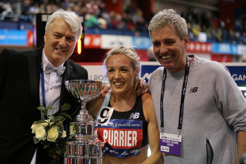 Three American Records Trampled On The Armory Track To Highlight NYRR Millrose Games By Doug Binder, DyeStat Editor NEW YORK CITY – Ajee’ Wilson and Donavan Brazier running down their own American records in the 800 meters at the NYRR Millrose Games are bankable moments that come from two U.S. medal contenders at the upcoming Tokyo Olympic Games. Elinor Purrier’s American record in the Women’s Wanamaker Mile was a bit more magical – a breakthrough moment in a young career that was shocking, even to her. Purrier sped through the finish line in 4:16.85 as the top four women all broke national records. Purrier became the second-fastest women’s indoor miler in history – behind only Ethiopia's Genzebe Dibaba – and the 10th-fastest to ever cover the distance indoors or out. The only U.S. woman to ever run a mile faster was Mary Slaney, outdoors, in 1985 (4:16.71). INTERVIEWS & RACE VIDEOS | PHOTOS | RESULTS | ALSO - NICO YOUNG SMASHES HS 3K RECORD | MARLEE STARLIPER RUNS AWAY FROM FIELD IN HS GIRLS MILE She was stunned trying to process the result. “I’m still trying to grasp it,” Purrier said. “I’m so surprised.” Purrier, who grew up on a farm just a few miles south of the U.S.-Canadian border in Vermont and graduated from the University of New Hampshire in 2018, stripped an astonishing eight seconds off her previous personal best. “Honestly it’s only my second race indoors so far, so I wasn’t sure of my fitness,” she said. “The race I did two weeks ago went well, but I wasn’t really sure.” Purrier unleashed a big kick to run down and overtake 2019 Women’s Wanamaker winner Konstanze Klosterhalfen, who was the first to 1,500 meters (3:59.87). Purrier made up three-tenths of a second in the final 100 meters and swept around the final turn to grab first place.