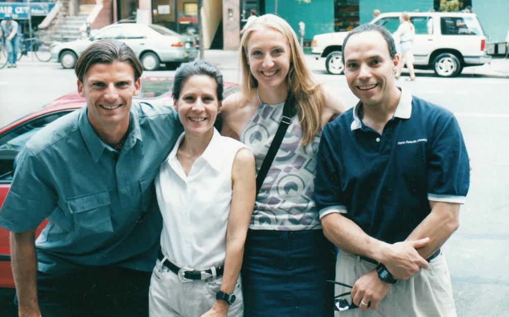 PHOTO: (left to right) Gary Lough, Jane Monti, Paula Radcliffe and David Monti after the 2001 NYRR New York Mini 10-K (photo by Mary Wittenberg)