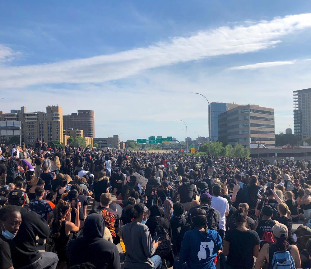 We begin on a bridge. A highway spanning the Mississippi River. Not the sprawling, torpid Mississippi of the southern United States, but the river closer to its inception, the stretch that courses through downtown Minneapolis, not far from its northern headwaters. This bridge, Interstate 35-West, would typically hum with traffic at 5 o’clock on a Sunday afternoon, but tonight it is strangely, almost absurdly, carless. The vehicles have been replaced by a legion of protesters, a throng of perhaps 6,000 marching from U.S. Bank Stadium at the south end of the crossing toward the University of Minnesota campus on the opposite side. A massive, boisterous crowd — caught in transit. Local news helicopters hover overhead, a common sight after days of marches following George Floyd’s killing by Minneapolis police officers six days prior. The perspective from above offers a sense of scale and magnitude, but no hint of intimacy or urgency. For that, you need to get down to street level.