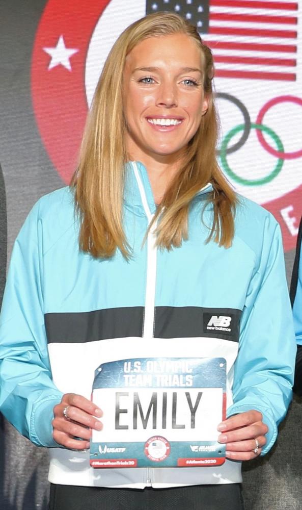 PHOTO: Emily Sisson at the 2020 USA Olympic Trials Marathon pre-race press conference (photo by Jane Monti for Race Results Weekly)