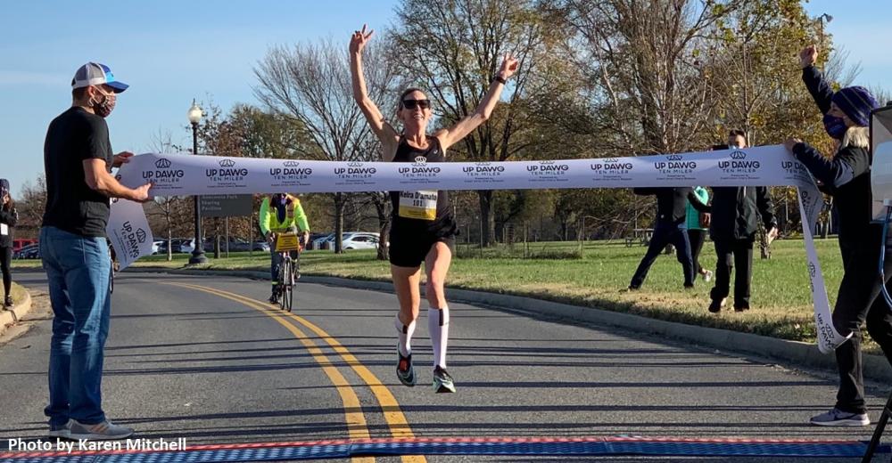 PHOTO: Keira D'Amato setting the USA record for 10 miles in an all-women's race (51:23) at the Up Dawg 10-Miler in Washington, D.C., on November 24 (photo by Karen Mitchell; used with permission)