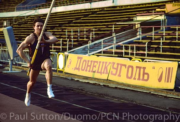 We proceeded to shadow Bubka, first from the primitive track made of loose rubber squares where he sprinted and drilled, hurdled and high jumped, and of course vaulted, while track kids ran the stadium steps and a 400 hurdler worked the turn. Then: to his makeshift weight training station inflected by connecting a pipe to a pair of concrete-filled can grips for a barbell and chest press. And finally to a gymnastics studio where Bubka flipped and leaped and dove around apparatus more common to diminutive, lighter than air performers offering hand gestures that paid homage to ballet. Bubka, 6 feet and 176 pounds, had perfected control of his size and power, caressing his pole like a cue stick, and not seeming to waste an ounce of energy in any skill he approached. He summoned a kind of refined aggression. He joked and smiled broadly, with a self-effacing demeanor and easygoing pride, following his coach’s instructions to the letter while hinting at responsibility for what he could sense then but barely express. “It’s good to be home,” he told me in his excellent English, having recently returned from a training camp in Spain. “My friends, my language, my people,” he added. Then he shrugged. “Some problems… but it’s okay.” I peppered Bubka and his coaches with questions and scribbled notes while Steve and Paul snapped away. Keith brought a prototype Nike vaulting shoe for Sergey to inspect and try out. All of us felt privileged to be in Bubka’s private domain as the first Western contingent to observe the intricacies of technique, speed and power that made the man. It was clear from the outset that as Bubka segued from one training venue to another he left no aspect of athleticism untouched. Indeed the pole vault may be the most complex and consuming event in track and field. When Bubka hurdled, he alternated lead legs. When he sprinted 60 meters in full sweats and training shoes, from a standing start, he clocked a world-class 6.68. When his coaches placed a 120-kilo weight (264 lbs) on his shoulders, Bubka jumped up and down with it 20 times. In the gymnastics studio, he did handstands walking around. He climbed the ropes using only his arms in the moment it takes to sneeze. When it was time for a massage, the therapist took a quick measure of Bubka’s physique: biceps 14 ½”, chest 44 ½”, waist 34 ¼”, quads 23 ½”, calves 17 ¾”. Bubka’s supple dimensions spoke out. “The muscles are elastic,” the therapist concluded. “They can ‘play.’” In the mornings, Keith and I ran before breakfast along the banks of the Donets River, secured today by Russian troops positioned for their continuing assault on the east. Then, Donetsk was a scene of placid conformity. Young girls in matching blue-and-white outfits gaily walked off to school. Parks and gardens glowed with spring planting. A national soccer match was coming up at the track facility and laborers mowed the field to a fine edge while women in platoks painted the wooden perimeter. In the evenings, dinner at the Bubkas’ apartment, spacious but nothing fancy, was a feast of Ukrainian delicacies prepared by Bubka’s mother, with track talk well into the hours and plenty of vodka on hand. There was also talk of those “problems,” the struggle to bridge communism with something better, perhaps a hybrid for a while—a bold quest for a society hard-wired to the past. “All conversation is about food, clothing,” said our Donetsk guide, a young woman employed by Bubka’s club. “People no longer talk about culture or sports. It’s a pity.”