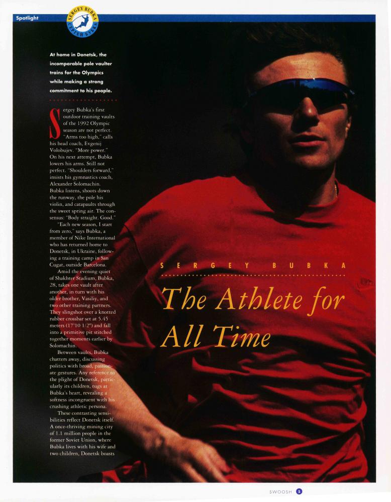 While the convergence of politics, finance and media confer world bodies and their global events with an aura of omnipotence, these powerful groups hold little sway in the larger world, where men and their machines, frankly, don’t give a damn. Bubka’s reign as both world indoor and outdoor record holder lasted for 30 years, from 1984 to 2014, a record unto itself (not to mention his six straight world outdoor titles, plus four more indoors), reasons why many in the sport consider Bubka the singular performer of track-and-field. His last indoor mark of 6.15 meters (20’ 2 ¼”) was set at—where else?—Donetsk’s All Star meet in 1993. His last outdoor mark of 6.14 meters (20’ 1 ½”), in Sestriere, Italy, was achieved in 1994. It took another 20 years for the indoor mark to be eclipsed, when the 2012 Olympic champion, Renaud Lavillanie of France, jumped 6.16 meters (20’ 2 ½”) at—yes, again—the 2014 Donetsk event. It’s rather obvious that Donetsk is (rather, was) to pole vaulting what Boston is to the marathon. While Armand Duplantis, the latter-day Bubka, has broken the world indoor record four times capped by its current standard of 6.20 (20’ 4”) set at the recent World Indoor Championships in Belgrade, Serbia, Bubka’s world outdoor record stood for 21 years until “Mondo” vaulted 6.15 meters (20’ 2 ¼”) in Rome in 2020. And that’s where the record stands now, with every expectation that’s Mondo’s magic will soon push it skyward. In 2014, the demise of Bubka’s All Star event--a prized civic endeavor with at least 300 children enrolled in the sporting club’s pole vault school—was, after all, a minor casualty, considering the human toll in Putin’s first, testing war against Ukraine. Called a “humanitarian disaster” by Marie Yovanovich, the former American ambassador to Ukraine, Putin instigated “Russian-separatist” uprisings in Donetsk and Luhansk while also taking control of the Crimea in the South with its proximity to key shipping routes in the Black Sea. In effect, in the east, Putin unleashed a civil war in Donetsk and Luhansk, where Russian forces and Ukrainian military attempting to hold their ground have been fighting for eight long years in what was considered an initial stage in Putin’s future bid to annex further Ukrainian territory and perhaps the entire country. The conflict has claimed upwards of 14,000 Ukrainian lives and destroyed everything in its wake while uprooting countless citizens. A Ukrainian journalist, telling of her mother’s reluctant decision to give up her life and friends and leave Donetsk in 2014, said she had no choice. “In Donetsk,” she wrote in an Op-Ed, “Russian-backed forces tortured detained civilians.” These forces had the gall to call themselves, “The Donetsk People’s Republic.” I traveled to Donetsk in a party of four. At the time, Nike grouped its marquee track and field athletes around the world with a marketing concept called, “Nike International,” promoting products with the star quality of its sponsored performers. The roster, some 50 men and women, a tapestry of athletes from 17 countries, included the likes of American sprinter Michael Johnson, Australian marathoner Steve Moneghetti, Kenyan distance runner Yobes Ondieki, Finnish javelin thrower Seppo Raty and Larissa Berezhnaya, a Ukrainian long jumper. To enhance Nike efforts in the early nineties, I and two colleagues, the photographers Steven Sutton and Paul Sutton, who led the international sports photo agency, Duomo, created a publication we called “Swoosh,” (see photos) to report on the athletes. I had collaborated with Steve and Paul, brothers from New York, on many projects through the years and we formed a seamless trio. The magazine came out three or four times a year, was sent to thousands of athletics’ journalists and others, and was made available at world and Olympic events. Considering the project’s raison d’etre, one provocative feature of every issue, devised by our Nike liaison Keith Peters, who accompanied us to Donetsk, was a summary translation of various stories in four other languages printed on different stock paper within the magazine. When we arrived at Moscow’s Sheremetyevo International Airport, there was no guarantee we would even wind up in Ukraine. We had no Ukrainian visas and were relying on Bubka’s pull—his Sport Club was “hosting” us—to do the rest. To insure our safety (people were jailed for less), a Bubka confidante ferried us by yellow school bus to a smaller airport for domestic travel. Then we had to get past security police who looked the other way—either because they loved the pole vault or were paid off handsomely by a certain reputed athlete—while the four of us pushed ahead of outraged passengers. Then we had to call up our high school track speed dashing on the jet way to be first on the flight, which, we were told, made one trip a day and was always overbooked. It was every man for himself. We were quite a sight—the Ugly Americans indeed, made worse when we arrived at Donetsk’s Prokofiev Airport (which would be destroyed in 2014 during war in Donbass) and had the audacity to stand and lean in for departure ahead of the crew. The insult was palpable. The policy was: pilots off first, then flight attendants, then us common folk. Finally, travel-weary after almost 24 hours en route, we piled out of the plane and into the waiting arms of Bubka’s entourage, alight on the runway, to shepherd us into our week’s stay as witnesses to Bubka-style training immersion; and, if I may say so, leavened by a visitor’s naïve assumption that all was right in the new independent nation of Ukraine. Keith had made an earlier trip to Donetsk in mid-winter with Nike top executive Steve Miller, along with several top vaulters, to Bubka’s all-star meet to insure that NBC was able to put together its up-close-and-personal feature for that summer’s Barce
