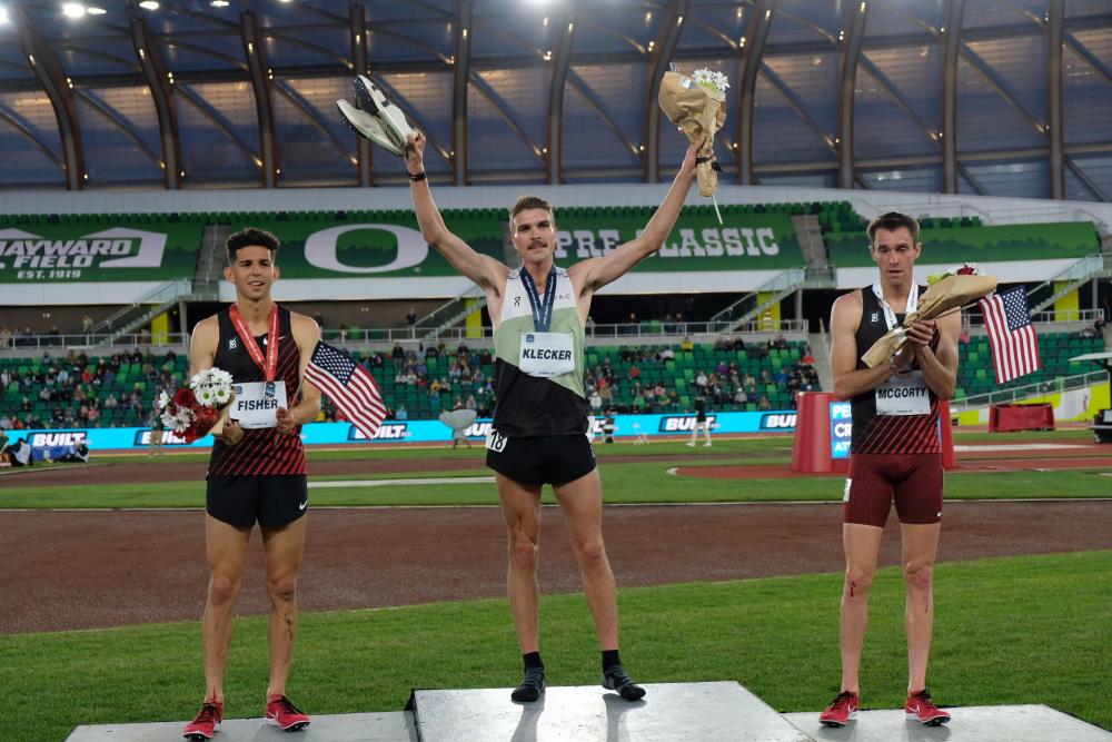 PHOTO: The men's podium finishers from the 2022 USATF 10,000m Championships (left to right): Joe Klecker (1st), Grant Fisher (2nd), Sean McGorty (3rd) (photo via Chris Nickinson)