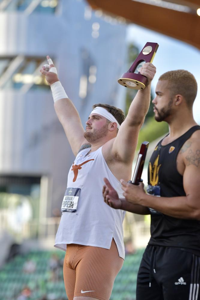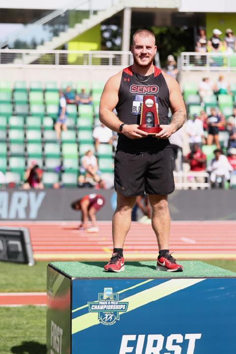 Jacobs Overcomes Early Stumble To Win 10,000; Piperi Wins Second Shot Put Crown; Pinnock Completes Long Jump Sweep; Blomquist Goes From Last In 2019 To First In 2022 To Win Hammer By Doug Binder, DyeStat Editor Phil Yearian Photos | Kim Spir Photos | Chuck Aragon Photos EUGENE, Ore. – Dylan Jacobs was unfazed by stepping on the rail and falling eight minutes into the NCAA Division 1 men's 10,000-meter final Wednesday. Nor he was concerned about Athanas Kioko of Campbell running out to a 100-meter lead on the field for two and a half miles. Steady until he was ready, the Notre Dame junior picked his spot and closed in 55.45 seconds to win the championship race in 28:12.32. "We prepared every day to come out to nationals and perform, and it worked out today where I was able to take it home, so I'm so grateful for that," Jacobs said. It wasn't the first time that Jacobs had set out after a big goal and achieved it. As a senior at Sandburg (Orland Park) High in Illinois, he won the Foot Locker Cross Country title in 2017. At Notre Dame he has made steady progress and became the first 10,000-meter champion for the Irish men since Ryan Shay in 2001. "I got my butt kicked a lot early in college and it's been slow trying to get to the top," Jacobs said. "It's day in and day out being prepared, recovering, doing everything possible to be a better runner. I'm so fortunate to be at this level right now and compete with the best guys in the country." Jacobs came into the race with the sixth-fastest time this season, although he did win the 10,000 meters in April at the 62nd Mt. SAC Relays, and also won the ACC 5,000-meter title in May. The race started out with Kioko clipping off 63-, 64- and 65-second laps to build a big lead. But the pack caught back up before the midpoint and by the end it had boiled down to Jacobs, Northern Arizona's Abdihamid Nur, the NCAA Indoor 3,000 and 5,000 champion, and Oklahoma State's Alex Maier. Jacobs pulled away from Nur over the final 200 and Maier gave chase on the homestretch but ran out of track to catch him. In the meet's first final, the men's hammer throw, Southeast Missouri State's Logan Blomquist won a riveting competion in which the top three finishers all logged personal bests and the lead changed hands four times. Blomquist, who finished dead last in the 2019 NCAA final and missed the 2021 meet due to injury, delivered the Redhawks' first national championship in any event on his sixth-round throw, which traveled 240 feet, 8 unches (73.37m). "I came in thinking I was capable of throwing far," Blomquist said. "I was nervous. One throw (to win), that was it." Blomquist's fifth-round throw brought him into a tie with Minnesota's Kostas Zaltos (237-10) for the lead. His sixth throw passed Penn State's Tyler Merkley (238-6). Texas standout Adrian Piperi won his second shot put title and got the work done early with a first-round mark of 70-7.25 (21.52m), replicating his win in Austin in 2019. That first throw was enough to win the competition. He fouled his next three attempts and then threw 69-8 (21.21m) in the fifth round, which was also long enough to win the title. Piperi's 10 points kept the Longhorns afloat although one of the co-favorites to win the team championship took a few hits on Wednesday with athletes not advancing to Friday's finals. Micaiah Harris, for instance, advanced to the 200-meter finals but not the 100. Arizona State's Turner Washington, the defending champion and the 2022 indoor champion, finished second with 69-0.75 (21.05m). In the men's long jump, Tennessee freshman Wayne Pinnock added the outdoor title to his indoor victory in March. Pinnock, who is from Jamaica, won by a razor-thin margin. He jumped exactly 8.00 meters (26-3) to tie Florida State's Jeremiah Davis on his sixth and final attempt. Pinnock's second-best mark was three and a half inches farther than Davis' and that broke the tie. It was the shortest winning mark at the NCAA Championships since 2014. Ayden Owens-Delerme of Arkansas capped a terrific first day in the combined events by running an all-time collegiate decathlon best 46.10 in the 400 and has 4,490 points halfway through the competition. He achieved three personal bests Wednesday. Kyle Garland of Georgia, the collegiate record holder, is 49 points back with 4,441. More news |