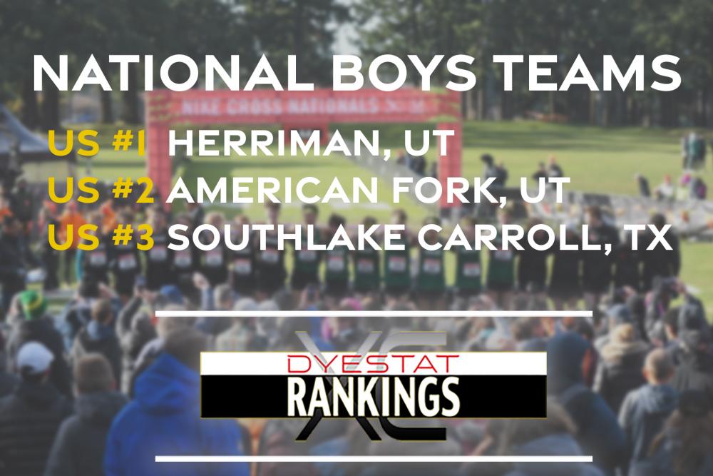 Utah Schools Herriman, American Fork Have Eyes On Winning The Southwest's First NXN Title By Doug Binder, DyeStat Editor 2023 Boys Early Season National Rankings Here's a thought: Perhaps it's time to fold New York into the Northeast region and let Utah have a crack at being a one-state "region." At the outset of 2023, it appears that Herriman UT and American Fork UT are close enough to be labeled 1A and 1B heading into the boys high school cross country season. The two schools are separated by less than 24 miles. Already, the two powerful squads have gone head to head and the result, at the Timpanogos Invitational, was 49 to 49. Herriman won the sixth-man tiebreaker. This tug-of-war could go back and forth until the Utah state meet in late October and at NXR Southwest after that. What we do know is that Herriman is going back to the Woodbridge Cross Country Classic presented by ASICS and the group led by William Steadman, Tayshaun Ogomo and Jonah Tang is aiming to win the massive Southern California invitational for the second straight year. There is no doubt about who the standout individual is. American Fork's Daniel Simmons was second at NXN last year as a junior and followed that up by running 8:34.14 for second again in the 3,200 meters at the Arcadia Invitational. Utah is one of the states that has lifted the cover off the season and that's done something to reveal who is fit and ready entering the fall. That's not the case yet in bunch of other states. So the first national ranking of the season includes teams that are getting some credit for early race performances, others that may be held back a few spots based on conservative early efforts, and a lot of speculation about the rest. Within the top 10, Southlake Carroll of Texas appears to have an especially deep team even by Southlake Carroll standards. The Dragons, who are led by coach Justin Leonard's sophomore son, Caden, could be on the verge of a special season. Crater of Oregon lost No. 1 Tyrone Gorze but returns a talented 2-6 group that could challenge for a podium spot at NXN, which the Comets missed by one spot last year. Crater will get a big test next weekend when it matches up with Herriman. Junior Josiah Tostenson is now in the forefront. Belen Jesuit, which returns almost everybody from last year's team, might be regarded as the best team in Florida history by the end of the season. Senior Joshua Ruiz and freshman Marcelo Mantecon are looking to lead the team to the NXR Southeast title. California, in the wake of Newbury Park's era of dominance, should be a lot more competitive than it has been in recent years, with Ventura, Trabuco Hills and San Clemente the top-rated teams going in. All three are ranked between No. 6 and 11. In the Heartland, Stevens Point WI brings back talented duo Aloysius Franzen and Bode Erickson and SPASH could be a factor nationally. The Panthers will matchup with the Heartland's other top-ranked team, Wayzata MN, at the Roy Griak Invitational. In the Northeast, traditional power Christian Brothers Academy NJ leads the way with deep group led by junior Joe Barrett. Downers Grove North of Illinois and Carmel of Indiana appear to have the lead in the Midwest, but it will take some bigger meets to see how they can perform. Six Midwest teams are in the first ranking of the season. New York hasn't started yet, so it's anyone's guess who may have emerged over the summer and is poised to make a big impact. It generally takes early October, and the Manhattan Invitational, to get an accurate read. Fairport is expected to be the top team because it has the most coming back. The Top 40
