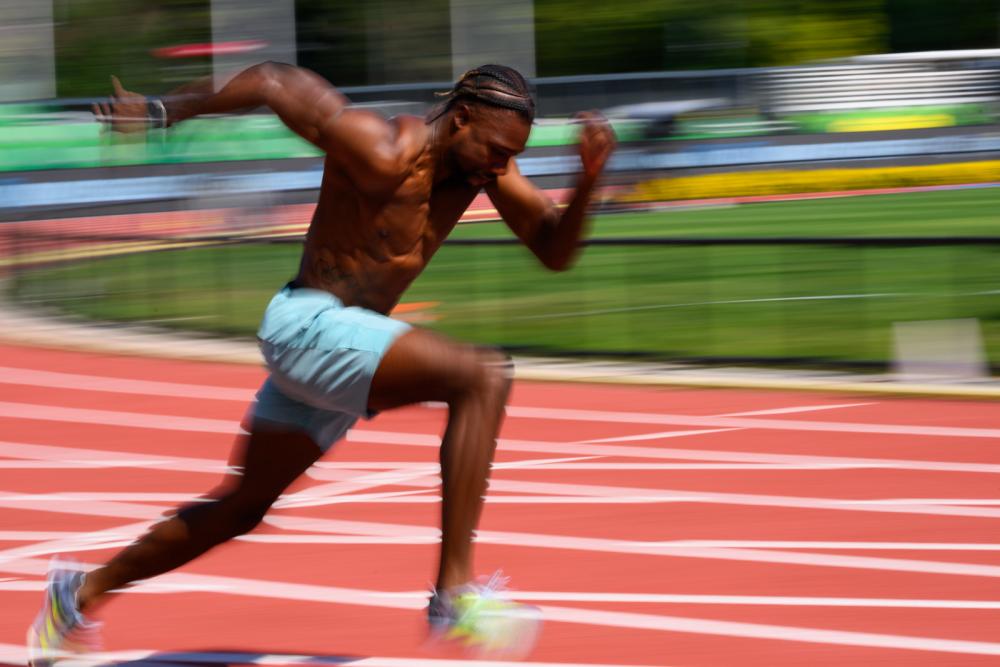 The incredible Noah Lyles, winner of three World Championships gold medals in Budapest, flashes his perfect form in practice before competing in the Diamond League final at Hayward Field in September.