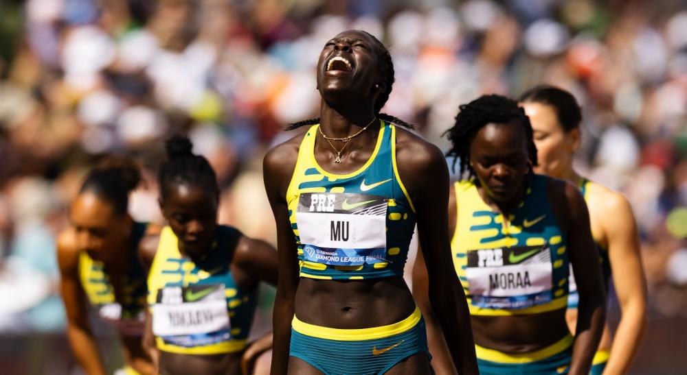 Athing Mu reacts to running a personal best and American record 1:54.97 in the women's 800 meters at the Diamond League final in Eugene.