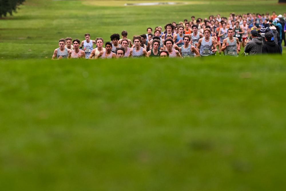 Leaders of the pack come into view before ascending a hill at Glendoveer Golf course during the boys championship race at Nike Cross Nationals.