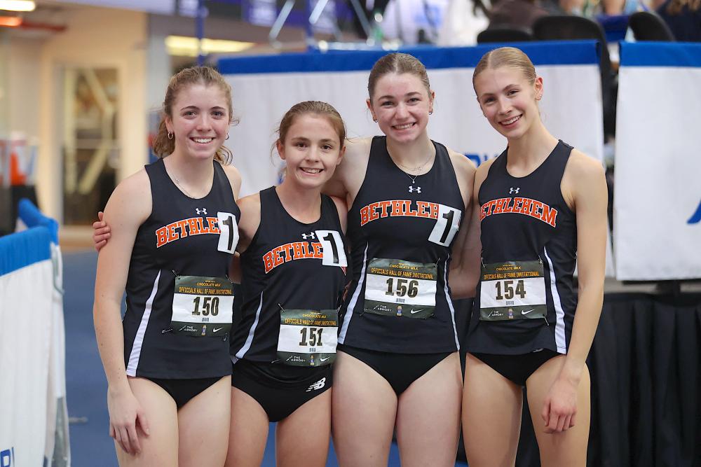 Alex Pelov, Tatnall Duo Ruby Schwelm and Katie Payne Earn Spots In Millrose Games Mile By Doug Binder, DyeStat Editor John Nepolitan Photos Jayden Horton-Sims entered his final high school indoor season with a bang on Saturday at the Refuel with Chocolate Milk Officials Hall of Fame Invitational at The Armory in New York. The Florida recruit from Philadelphia, running in the unattached section of the 300 meters, ran a time of 33.00 seconds for a US#1. It was slightly off his personal best set last year of 32.92, which is No. 8 on the all-time list. Three more spots in the high school miles at the 117th Millrose Games were also awarded. In the boys mile, Alex Pelov of Montville NJ earned his berth with a victory in a US#5 time of 4:14.52. In the girls mile, Tatnall DE teammates Ruby Schwelm and Katie Payne both were given spots. Schwelm won the race in US#5 4:54.13 and Payne was next in US#6 4:55.13. Bethlehem Central NY, which dominated the cross country season in New York, ran a US#1 time in the distance medley relay with 12:14.76. Charlotte O'Meara ran 2:16.08 on the 800 meters leg and Sophia Chromczak ran 5:11 on the anchor with a big lead. Another school with Nike Cross Nationals credentials, Monroe-Woodbury NY, won the boys distance medley relay with a national leading time of 10:20.92. Gavin Catherwood closed in 4:20.65. Monroe-Woodbury also won the boys SMR with 3:34.53. James Ciaccio from St. Anthony's NY won the boys 500 meters in a US#2 time of 1:03.61. Benjamin Berman from Bronx Science NY ran a US#6 time of 9:22.87 in the 2-mile. The Elmont Memorial NY Boys ran a US#9 time of 1:29.09 to break a meet record and win the 4x200 relay. Owen Keating from Pompton Lakes NJ jumped a big personal best and US#3 height of 16-6 in the boys pole vault. In the boys triple jump, Zachary Jefferson from North Brunswick Township NJ won it with 46-1. Joseph McDonald from Kingston NY won the high jump at 6-6. Adeline Barker from West Springfield VA won the girls 2-mile in 11:13.34. Sarafina Scavo from Sachem East NY won the girls 500 meters with US#7 1:15.53. Meagan Ewers of Medgar Evers NY won the girls weight throw with 51-11.75. Padua DE ran a US#4 time of 9:22.77 in the girls 4x800 relay. Harry S. Truman NY won the girls 4x200 relay in a time of 1:44.43. More news |