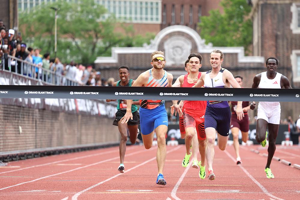 Bednarek Remains Unbeaten In Grand Slam Track, Runs 9.86; Jefferson-Wodden Lowers PR To 10.73 At Franklin Field By David Woods for DyeStat Photos by John Nepolitan The world’s fastest man and woman won’t be determined until more than three months from now in Tokyo. As of June 1 in Philadelphia, though, those designations apply to Kenny Bednarek and Melissa Jefferson-Wooden. Both sprinters ran world-leading 100-meter times Sunday, smashing Franklin Field records and punctuating the third Grand Slam Track meet with an exclamation point. Kenny Bednarek raised his series record to 6-0, blasting to a time of 9.86 seconds. That tied the world lead set Friday by Ghanaian sprinter Abdul-Rasheed Saminu of South Florida in the NCAA East Regional at Jacksonville, Fla. Bednarek, 26, has heretofore been known as a 200-meter sprinter. He has three global silver medals at that distance, including one from the 2024 Paris Olympics. Still, he has been a breakout performer of the new series. Despite the slowest reaction time, he tied for 12th on the all-time U.S. list in a race run with temperatures in the 60s and barely any wind (+0.8). “We still got a lot more to go,” Bednarek said. “We’re not even peaked yet. I’m just giving you a taste.” Jamaica’s Bryan Level was second in 10.02 and Great Britain’s Zharnel Hughes third in 10.05. Former world champion Christian Coleman was first at 20 meters before finishing fourth in 10.12. Jefferson-Wooden, 24, a former Coastal Carolina sprinter, has been a specialist in the 100. She won bronze at Paris. Yet no one could have foreseen a 10.73, tying for 10th on the all-time list and No. 5 among Americans. By comparison, that is .01 off the personal best by Olympic gold medalist Julien Alfred of Saint Lucia. Jefferson-Wooden, too, is 6-0 after Kingston, Miami and Philly. She ran a windy 10.75 (+2.4) at Miramar, Fla., on May 2. “I’m learning so many new things about myself,” she said. “The way I go about training, the way I’m staying disciplined even when I’m not feeling my best. And this is all coming together.” Men: Kerr overtakes Hocker in 1,500 Elsewhere in men’s races: >> Short distance: Cole Hocker’s kick didn’t bring him victory, but it was the closest he has come since Paris gold. In a reversal of the Olympic outcome, Britain’s Josh Kerr seized the lead late for his second slam 1,500 win, clocking 3:34.44. Hocker was second in 3:34.51. Their respective last 200s were 25.87 and 26.19. “That was just a really fun homestretch,” Kerr said. “It’s an interesting track. A lot of thinking going on today.” Hobbs Kessler was third in 3:34.91. Canada’s Marco Arop, after winning the 800, took the overall win by placing fourth in 3:35.38. Josh Hoey was fifth in 3:35.45. Yared Nuguse, on his 26th birthday, was sixth in 3:35.59. Arop and Hoey, the half-milers, were 1-2 with 200 meters left. Hocker said he reasoned they could not hold on to the end. Chiding himself for placing sixth in Saturday’s 800, he forged the pace before 300 meters elapsed. “I didn’t give myself a chance to win it. At all,” he said of the 800. “So today, that was my goal. I’m going to race it. The result is going to be where it is, where I’m at in training. “But you’re going to have to race today. But only one guy got me today. I can walk away from this feeling you had to work hard to beat me.” Hocker is winless in nine outdoor races since Paris. He is aiming for September’s World Championships at both 1,500 and 5,000. To that end, he will race a 5,000 at Stockholm on June 15 ahead of the last slam, set for June 28-29 at Los Angeles. “If I can work this low end, I have faith in the long end of it,” Hocker said. “And the ‘15’ is right in the middle of it. This is all working that fast-twitch muscle that I try not to neglect, ever.” >> Long distance: In his slam debut, Nico Young ran the final 200 in 25.61 to win a tactical 3,000 in 8:01.03. (By comparison, Tayvon Kitchen won the Oregon high school title Friday in 7:58.92.) Young covered the last 800 in 1:51.33 to beat runner-up Sam Gilman, 8:01.70. Former collegiate star Graham Blanks, also in his slam debut, was fifth in 8:03.22. Grant Fisher pulled out shortly before the race. >> Long sprints: Fifth in the 200 was enough for Britain’s Matthew Hudson-Smith to score a 16-15 victory over Alexander Ogando of the Dominican Republic. Hudson had won the 400 in 44.51. Ogando took the 200 in 20.13, followed by Trinidadian sprinter Jereem Richards in 20.34. Richards had 14 points. >> Short hurdles: After winning the110 hurdles, Jamal Britt secured overall victory by taking second in the 100 in 10.50 (-1.9 headwind). Trey Cunningham, also winner of the 100 at Miami, was first in 10.36. >> Long hurdles: Trevor Bassitt won the flat 400 in 45.47, ending Alison dos Santos’ perfect season and taking the $100,000 first prize. Bassitt, second in the 400 hurdles outscored dos Santos 20-18. The Brazilian was third in the 400 in 45.63. Women: Nugent tops McLaughlin-Levrone in 100 >>Short hurdles: Jamaica’s Ackera Nugent followed her victory in the 100 hurdles with another in the 100 dash, running 11.11. Sydney McLauglin-Levrone, dropping down from the long hurdles, was second in 11.21. She was racing 73 miles from her hometown of Dunellen, N.J. “It’s honestly been a few years since I’ve been here, so it’s nice to get a feel for it,” she said. “Great races from everybody all around. All the records show it’s a great track.” >> Long hurdles: Jasmine Jones was second in the 400 to take the overall victory 16-15 over Anna Cockrell. Britain’s Lina Nielsen won the race in 52.60, followed by Jones in 52.73. Cockrell, the hurdles winner, was sixth in 53.35. >> Long sprints: Marileidy Paulino of the Dominican Republican completed a sweep, clocking 22.46 in the 200. Isabella Whitakter was second in 22.82, and she was second overall. Bahrain’s Salwa Eid Naser, disqualified 