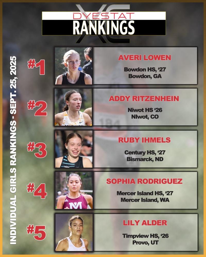 Individual Girls Top 30 Rankings - 9/25/25 By Keenan Gray of DyeStat 1. (5) Averi Lowen, junior, Bowdon GA - Won Wingfoot XC Classic title by over 90 seconds in 16:28.1, extending her undefeated record to three wins on the season. 2. (1) Addy Ritzenhein, senior, Niwot CO - Competing at Desert Twilight this Friday night, aiming to defend sweepstakes title. 3. (2) Ruby Ihmels, junior, Century ND - Has not race since Sept. 12 after winning Anderson/Stavn Invite title. 4. (5) Sophia Rodriguez, junior, Mercer Island WA - Ran cross country 5k personal best time of 16:10 at The Mook to win by over 18 seconds. 5. (10) Lily Alder, senior, Timpview UT - Bounced back in win column with close sweepstakes win over Chiara Dailey at Woodbridge, running 15:40 for three-mile race. 6. (14) Chiara Dailey, senior, La Jolla CA - Finished second at Woodbridge for second year-in-a-row, running 15:41.6 for three-mile course in sweepstakes race. 7. (3) Elin Latta, sophomore, South Texas Heat Homeschool TX - Won Nike South Invitational by over 12 seconds in 5k season's best time of 17:17.3. 8. (7) Jaelyn Williams, senior, Eastlake CA - Finished third sweepstakes race at Woodbridge in new cross country three-mile personal best of 15:52.2. 9. (17) Natasza Dudek, sophomore, Ann Arbor Pioneer MI - Won fourth race of the season in most impressive way possible at Jackson Invitational, running 5k personal best time of 16:29.4. 10. (8) Lilly Beshears, senior, Rogers AR - Has not raced since Sept. 6 after winning Southlake Carroll Invite title. 11. (12) Jazzlyn Garmer, senior, Webb School of Knoxville TN - Beat twin sister Calysta at Hare & Hounds Invitational for first win of season in 5k personal best of 16:57.3. 12. (9) Calysta Garmer, senior, Webb School of Knoxville TN - Finished second to twin sister Jazzlyn at Hare & Hounds Invitational, also running a 5k personal best of 16:58.1. 13. (28) Summer Wilson, senior, Irvine CA - Continuing to run impressive times early in the season, including a three-mile effort of 15:54.1 to finish fourth in the sweepstakes race at Woodbridge. 14. (15) Blair Bartlett, junior, Lawrenceville NJ - Made cross country debuts with wins in a dual against George School, then ran an impressive 16:48.7 for 5k at the Jerry Hart Cross Country Invitational by over 80 seconds. 15. (16) Gabbie Bishop, senior, Providence Classical Christian Academy AR - Won season opener at Straight Arrow Invitational in 17:35.5 for 5k. 16. (4) Paige Sheppard, junior, Union Catholic NJ - Finished fifth in sweepstakes race at Woodbridge in new three-mile personal best of 15:59.4. 17. (18) Sundara Weber, senior, Sandwich IL - Ran three-mile season's best 16:18.7 to win the First to the Finish Invitational title. 18. (47) Emry Schwalm, senior, Heritage CO - Completed an incredible late comeback to win Liberty Invitational title on home course in 5k personal best of 16:43.2. Heading up north to compete in Nike Portland XC on Saturday. 19. (11) Delaney Reuter, junior, Eaton CO - Finished a close second-place to Emry Schwalm at Liberty Bell Invitational in 5k personal best 16:43.4. 20. (20) Rozlyn Stowe, senior, Carbon UT - Won Border Wars in 5k personal best of 17:03.1 and Carbon Invitational title in three-mile time of 17:05.7. 21. (13) Macy Wingard, senior, Denton Braswell TX - Finished sixth in sweepstakes race at Woodbridge in three-mile personal best of 16:04.4. 22. (39) Brianna Reilly, eighth grader, Harrisburg SD - Won Roy Griak title in 17:58.4 for 5k, winning by nearly 30 seconds. 23. (NR) Jane Wangari, sophomore, Athens Christian GA - In only her second cross country race, ran 5k personal best 17:04.5 to win the varsity "A" race at Wingfoot XC Classic, beating the field by over two minutes. Only Averi Lowen was faster in championship race. 24. (21) Braelyn Combe, senior, Santiago (Corona) CA - Finished seventh in three-mile sweepstakes race in 16:11.1 at Woodbridge. 25. (NR) Madeline Dorsch, sophomore, Pinecrest NC - Finished third to the Garmer twins at Hare & Hound Invitational in new 5k personal best time of 17:03.7. 26. (22) Mallory Weller, senior, Fort Wayne Concordia Lutheran IN - Has not raced since season opener on Aug. 23 at Huntington North Invitational. 27. (23) Virginia Kraus, senior, Saucon Valley PA - Has not raced since season opener on Sept. 6 at DeSales Centaur. 28. (37) Emma Hoffman, senior, Otsego MI - Won Cougar Falcon Invite title by almost two minutes in new 5k personal best of 16:48.5. 29. (64) Leyla Bhusri, senior, Shenendehowa NY - Won Queesnburg Pre-State Invitational title in 5k personal best of 17:13.1. 30. (30) Libby Dowty, senior, Indian Creek IN - Has not raced since season opener on Sept. 6 at Brownsburg Invite. Watch List: Abigail Hennessy MA, Bailey Brackett NC, Mia Sirois IL, Emily Cohen CO, Ryin Miller KS, Maysen Fletcher WV, Ellery Lincoln OR, Isabella Keller IL, Claire Guiberson CO, Greta Hammer MA, Chase Gilbert CT, Maddie Gullickson MN, Gianna Rahmer NM, Jordan Banta CO, Ellie Maddox SD More news |