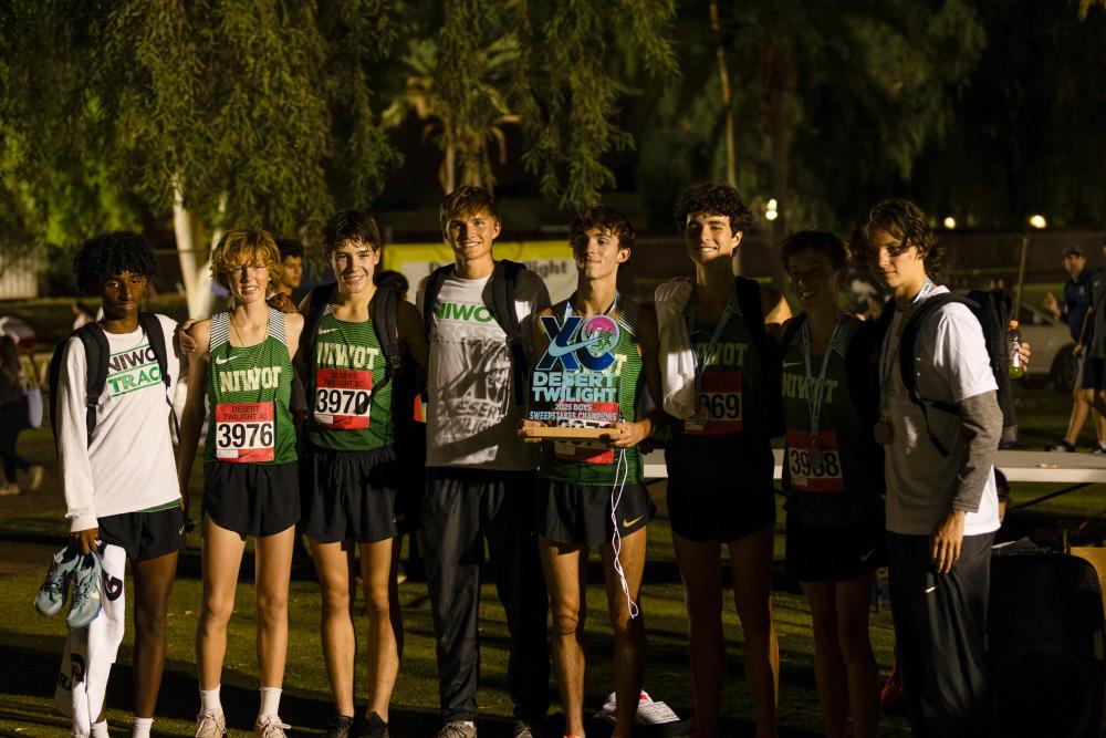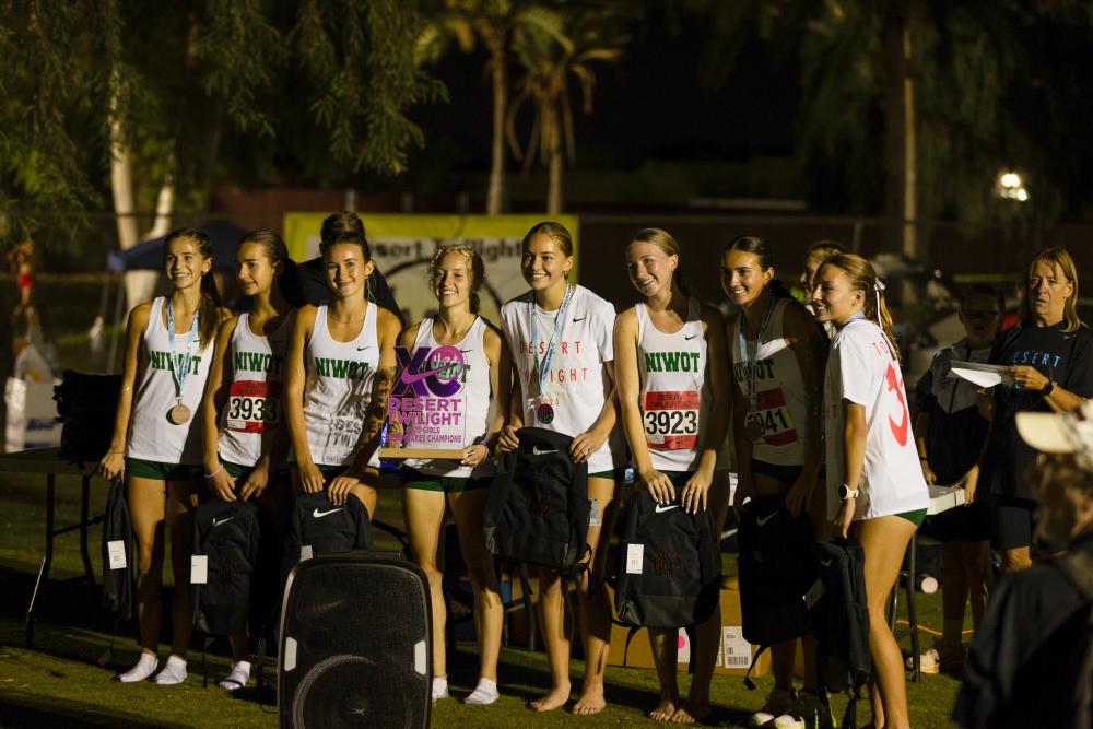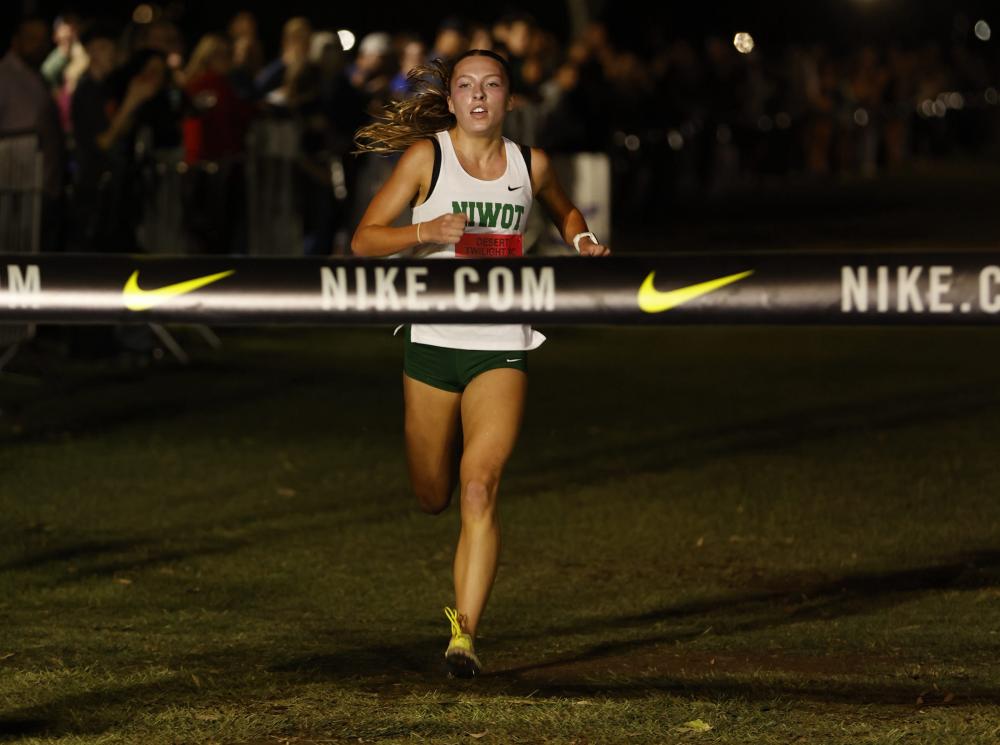 Addy Ritzenhein Wins Third Consecutive Individual Title At Desert Twilight; Oliver Horton Wins Duel With Yohanes Van Meerten By Doug Binder, DyeStat Editor Ethan Buck Photos Addy Ritzenhein won her third straight Desert Twilight sweepstakes race title on Friday night at Toka Sticks Golf Club in Mesa, Ariz. The senior ran a time of 17:00.7 to stave off a challenge from El Dorado NM sophomore Gianna Rahmer, second in 17:05.1. The No. 3-ranked Niwot girls put all seven of its runners in the top 25 and scored 51 points against a strong field that included Lewisville Flower Mound TX (104) and Bozeman MT (232). Adeline Bennett and Liana Cluley-Garza from Flower Mound finished third and fourth, respectively. Niwot's second runner, Anna Prok, was fifth. Scarlett Parks (15th), Emily Bolda (19th) and Avalon Beltran (21st) competed Niwot's scoring. Niwot's next best girls also won the championship division title and put five in the top seven, all of them between 18:32.1 and 18:41.6. In the boys sweepstakes race, Niwot made it a team sweep with four in the top 11 and a score of 48 points. In an elite race between two of the country's top juniors, Oliver Horton of Coronado CO held off Flagstaff's Yohanes Van Meerten as they both ran exceptional times. Horton, who was third in 2024, ran 14:23.9 for the third-fastest time in meet history. Van Meerten, who placed 11th at the Foot Locker Cross Country Finals last year, ran 14:25.7 for the fourth-fastest time. Niwot ran without Rocco Culpepper, who was second at the Desert Twilight last year, but Quinn Sullivan and Hunter Robbie finished third and fourth to lead the Cougars. Jude Ritzenhein, Addy's freshman brother, finished 11th for Niwot and was the team's fourth man. Ryder Keeton was two spots ahead of him, in ninth. Coronado CO finished second in the team standings with 188 points and Bozeman MT won a sixth-man tiebreaker with Mountain View UT for third after the both scored 212 points. Thompson Valley UT was fifth with 217. Carter Prater of Somerset Sky Pointe NV was fifth in the boys race in 14:50.6. Hamilton AZ's Zarian Rodriguez was sixth in 14:52.1. More news |