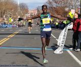 Indeed, that opening mile was ten seconds faster than last year, and soon the other key contenders caught up with Kemboi and Lynch. The leaders began the climb of Highland Street, then split 4:35 for the second mile despite the uphill. Kurgat and Kemboi put in a little surge for the King of the Hill prime (Kemboi got it by half a step), but that surge put them ahead of the rest of the pack except for 25 year-old Briton David Mullarkey, who was running in only his second professional road race. Mullarkey, wearing his Northern Arizona University kit, led Kurgat and Kemboi as the leaders turned left to run down Porter Street.